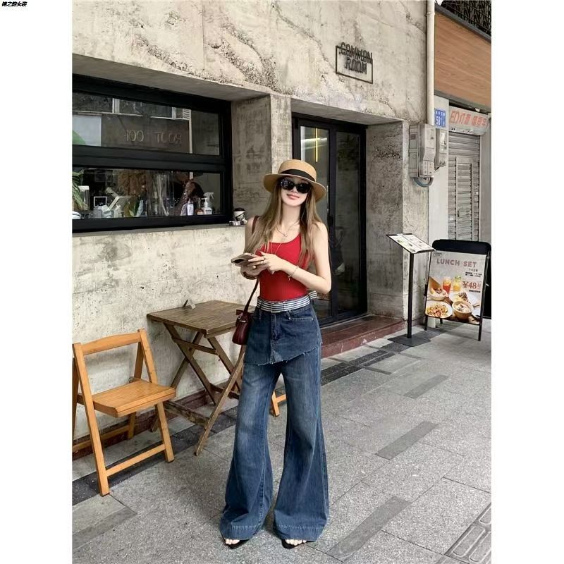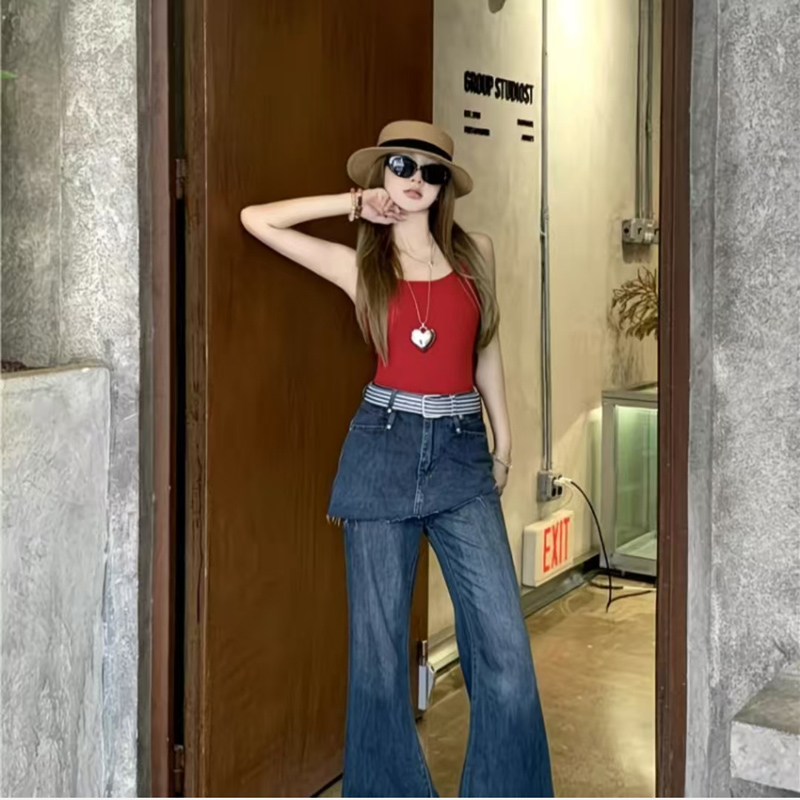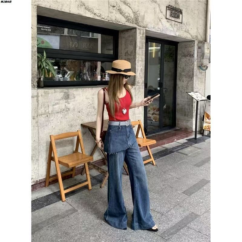 YF6871-图片色假两件不规则裙摆系扣高腰微喇叭洗水辣妹设计花边显瘦牛仔裤