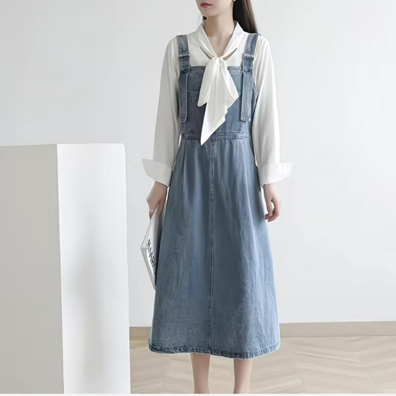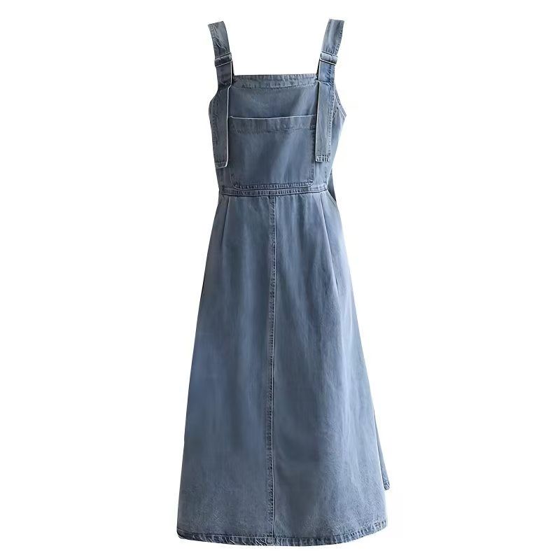 YF6875-图片色时尚休闲吊带褶折感A字宽松显瘦复古蓝色百搭牛仔裙