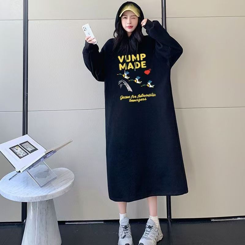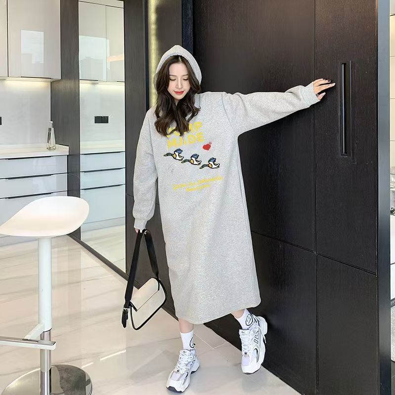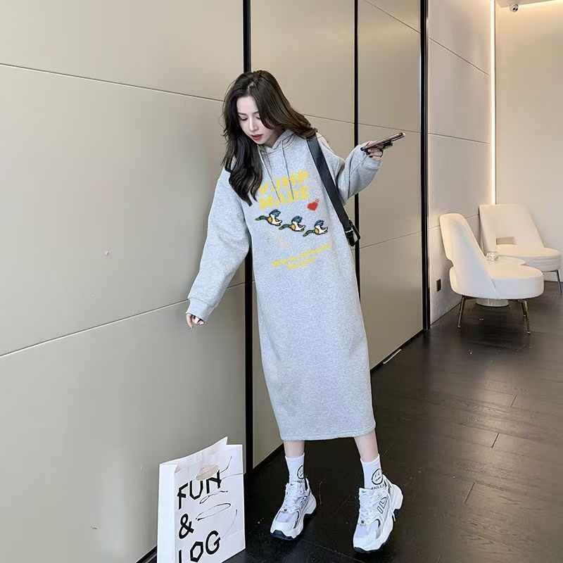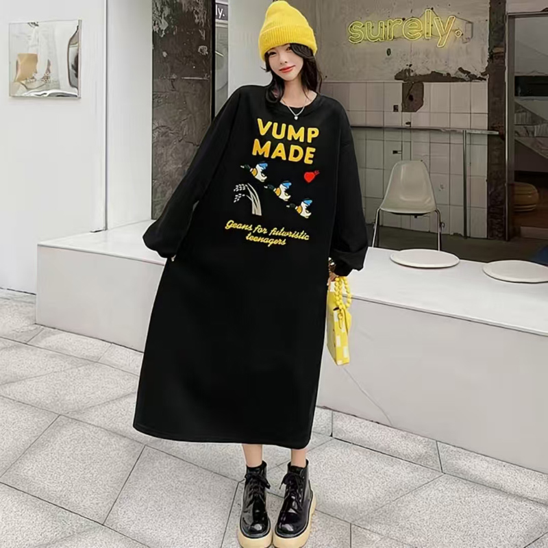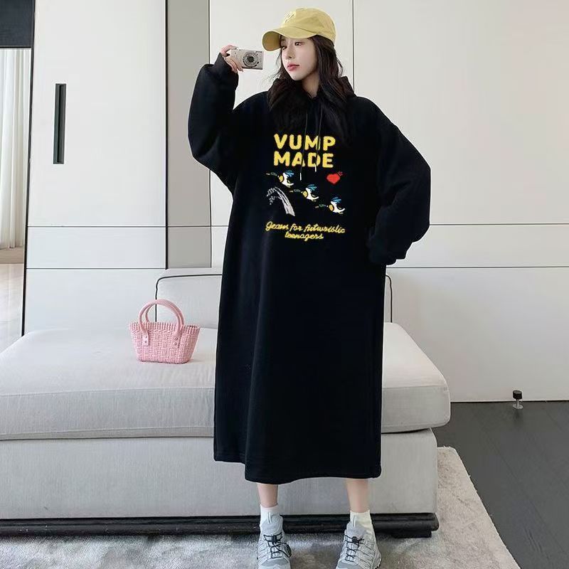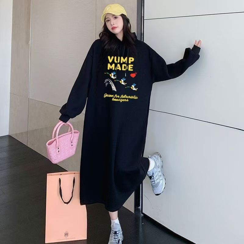 YF6876-(2色入内)秋冬慵懒风字母大雁印花长袖连帽宽松显瘦开叉设计卫衣裙