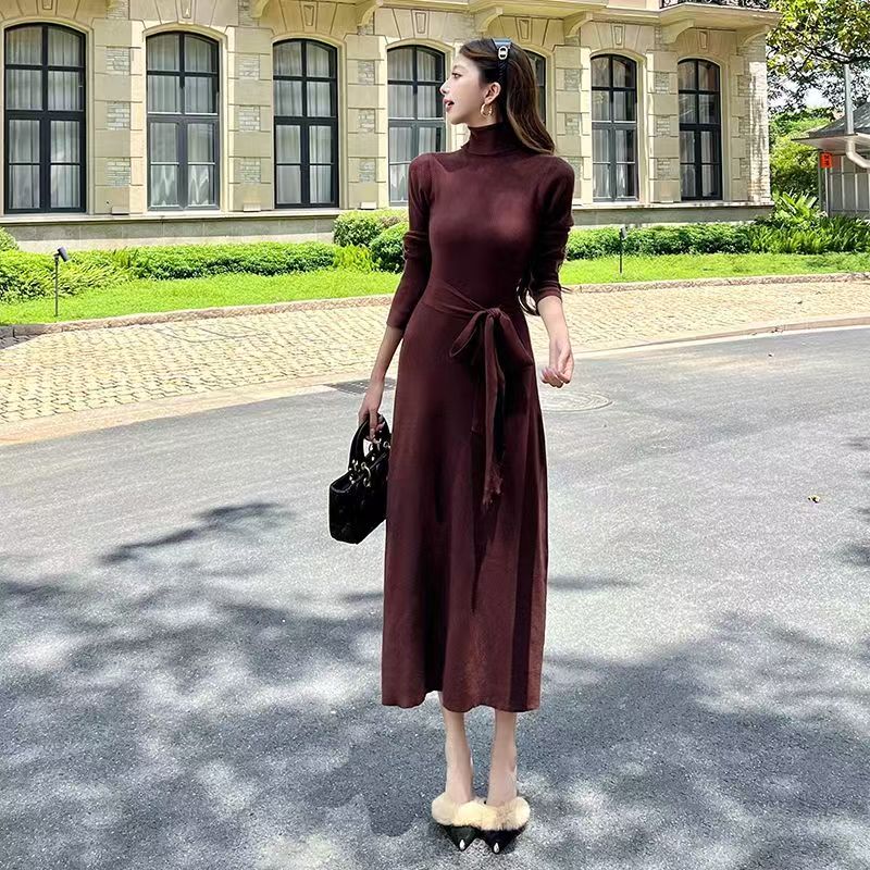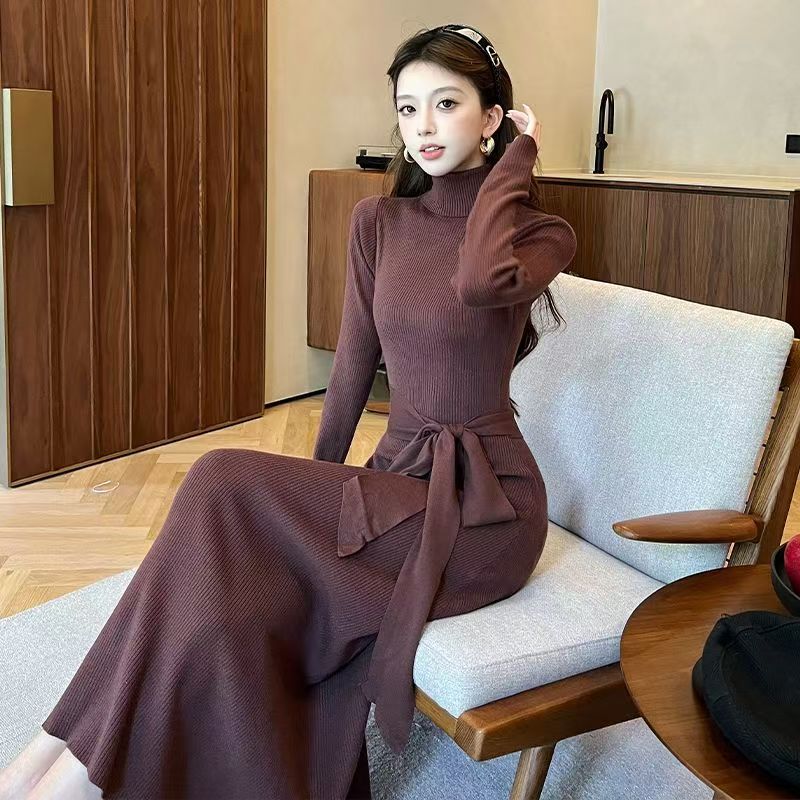 YF6883-图片色优雅时尚束腰绑蝴蝶结设计高领长袖过膝长款针织冬季连衣裙