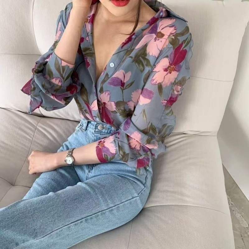 YF6886-(2色入内)韩版碎花复古设计长袖翻领系扣小众百搭休闲雪纺衬衣