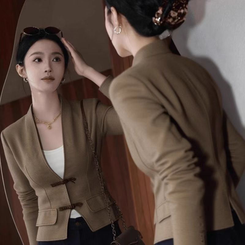 YF6889-图片色休闲春秋百搭长袖系扣收腰显瘦复古棕色个性短款夹克上衣