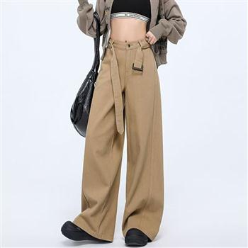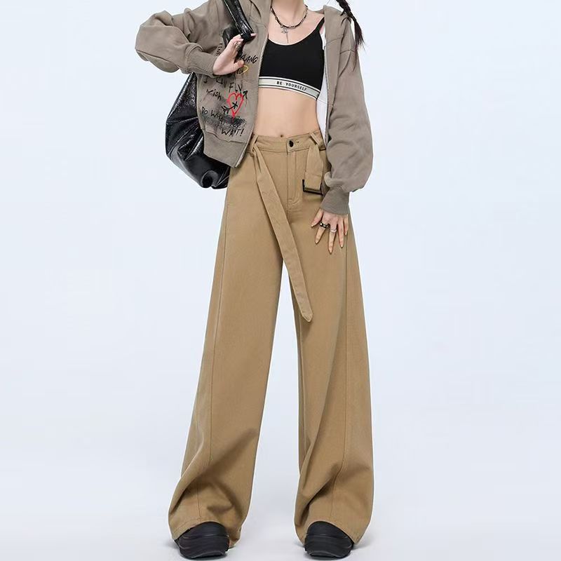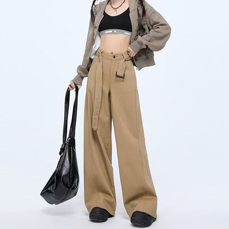 YF6890-图片色慵懒风系腰带直筒坠地感卡其色宽松显瘦复古大码牛仔裤