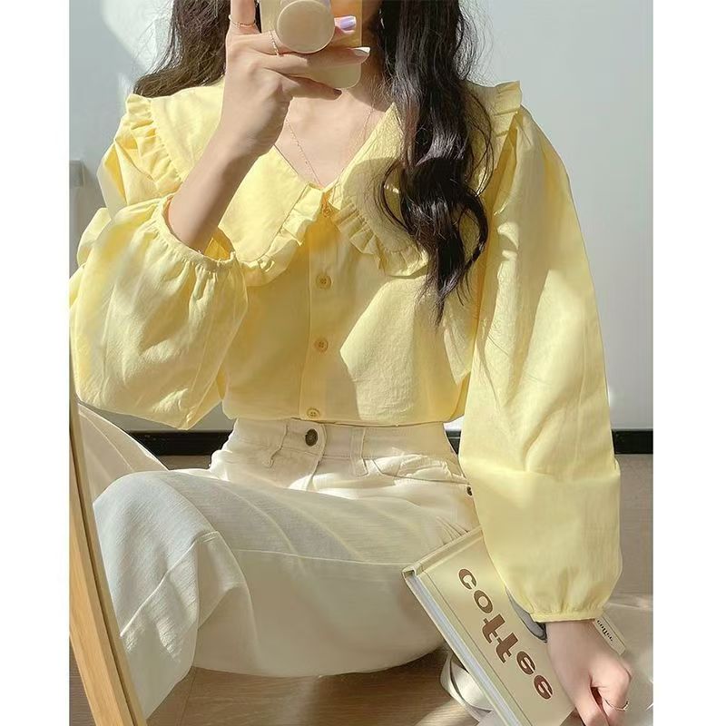 YF6894-(3色入内)春秋荷叶边娃娃领泡泡袖系扣宽松显瘦韩版复古气质上衣
