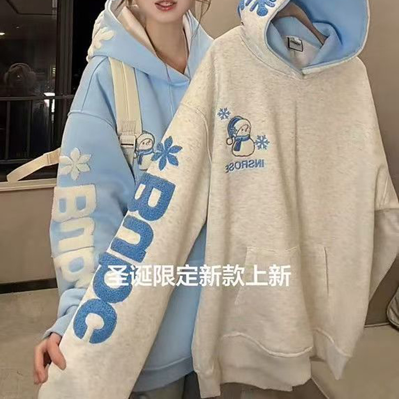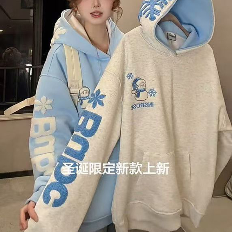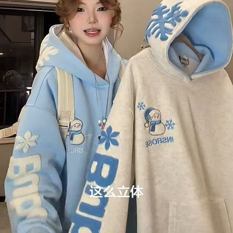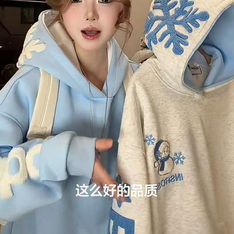 YF6896-(2色入内)时尚欧美风雪花刺绣慵懒风长袖连帽胖MM显瘦加厚卫衣外套