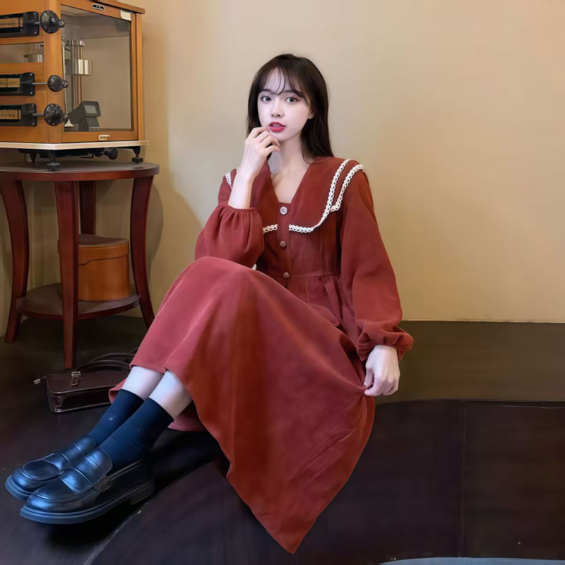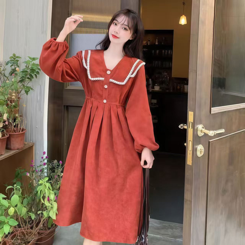YF6899-(3色入内)秋冬甜美娃娃领泡泡袖松紧腰显瘦灯芯绒保暖复古风连衣