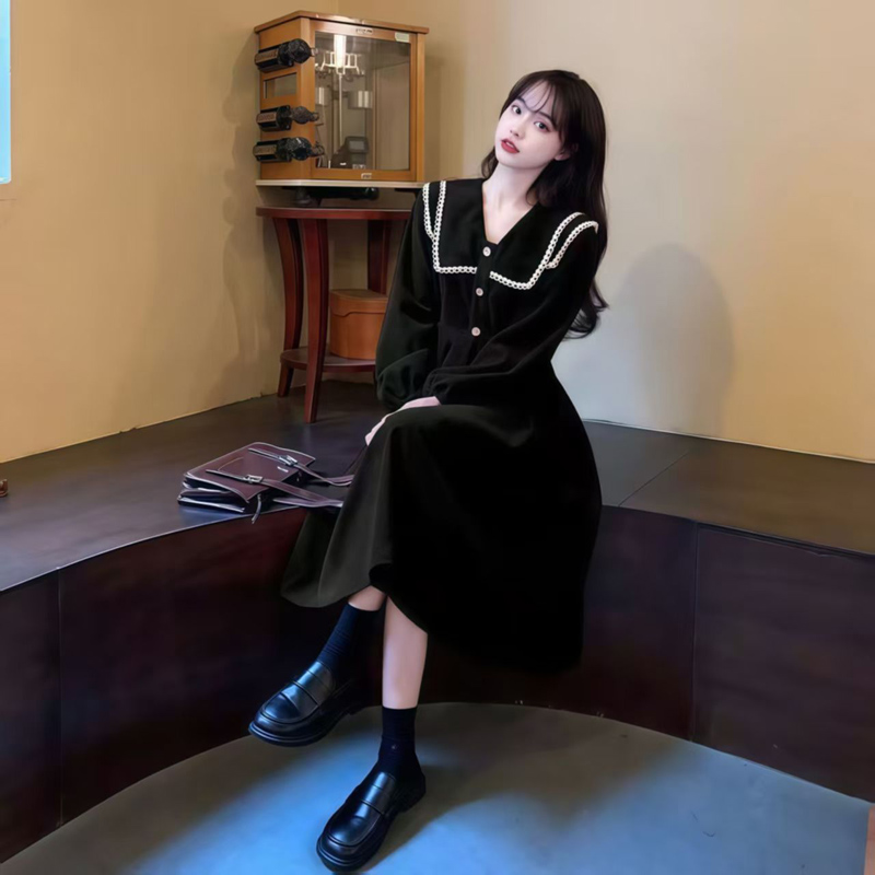 YF6899-(3色入内)秋冬甜美娃娃领泡泡袖松紧腰显瘦灯芯绒保暖复古风连衣裙
