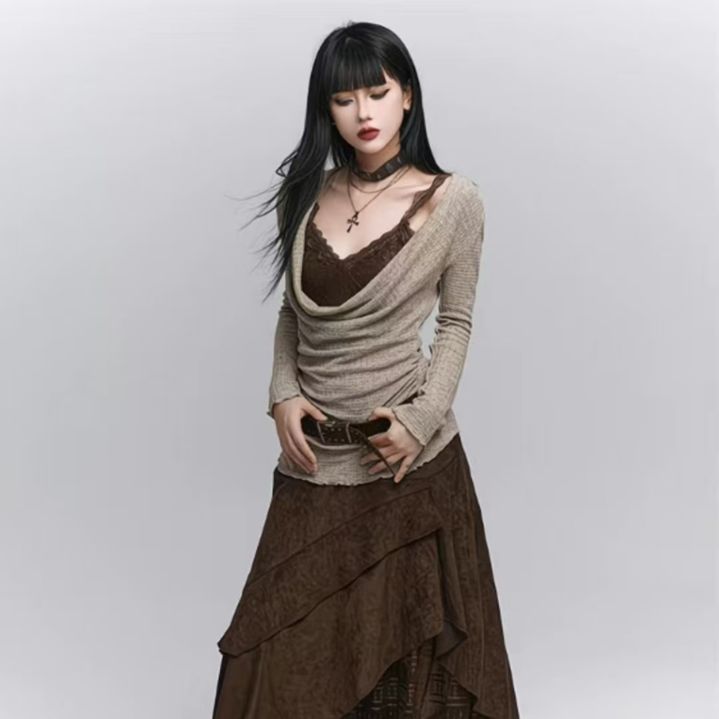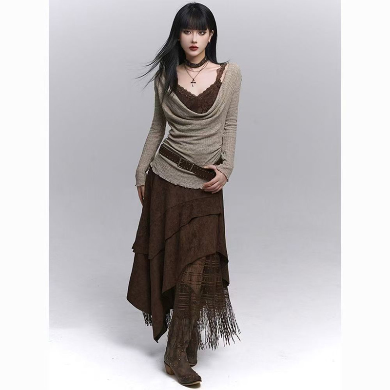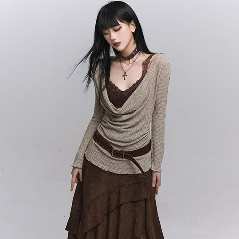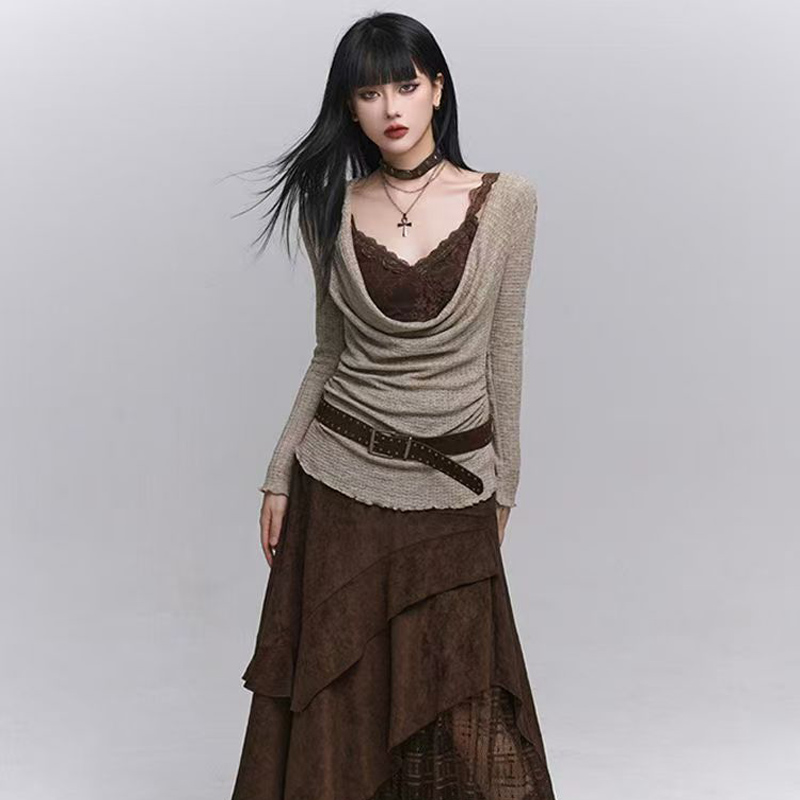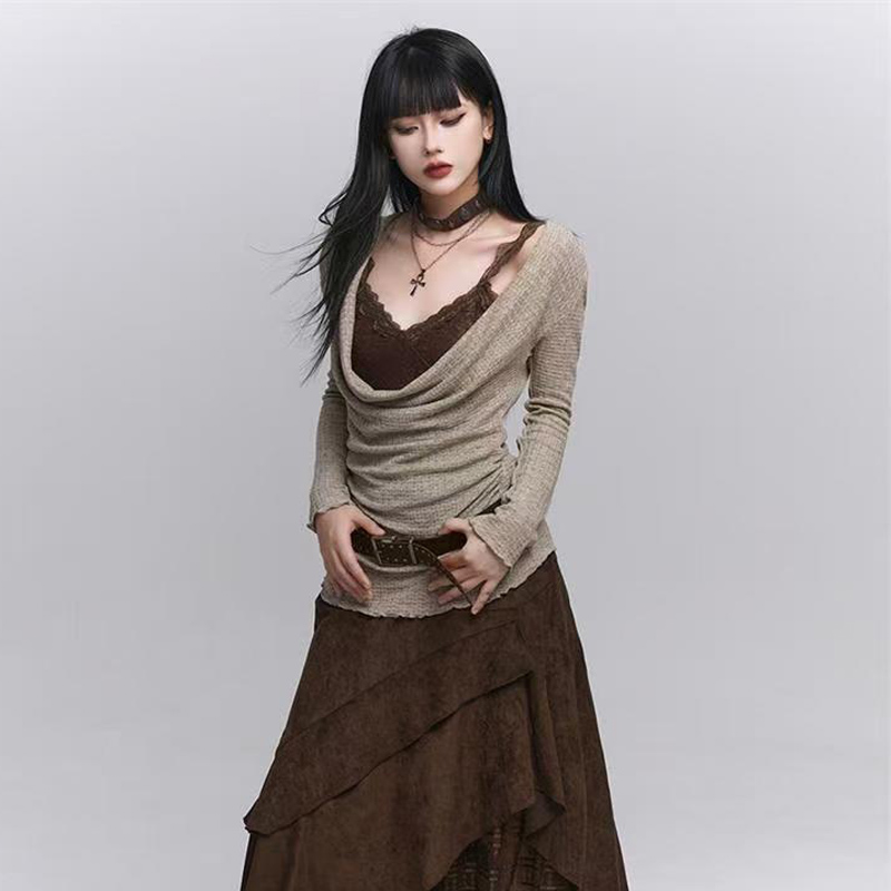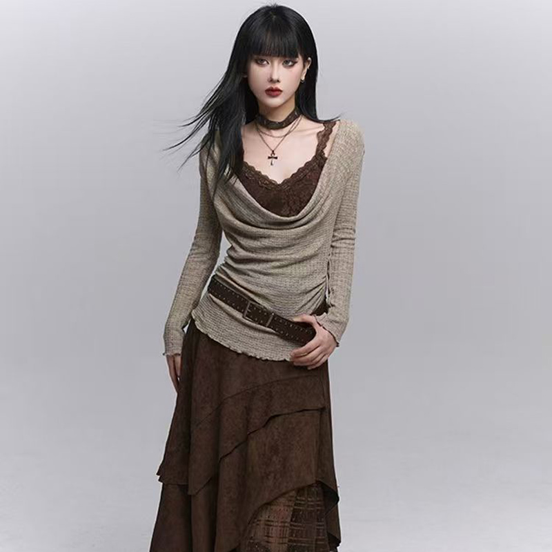 YF6902-图片色韩版两件套吊带蕾丝配长袖套头堆领宽松显瘦薄款针织上衣