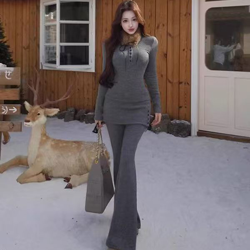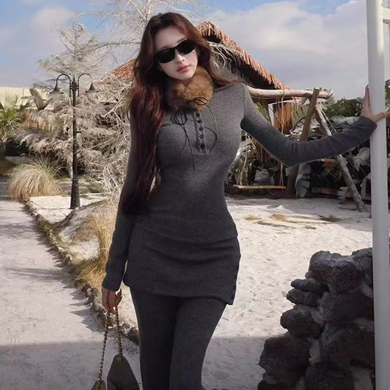 YF6903-图片色时尚秋冬名媛气质毛毛领围脖系扣弹力修身简约长袖T恤