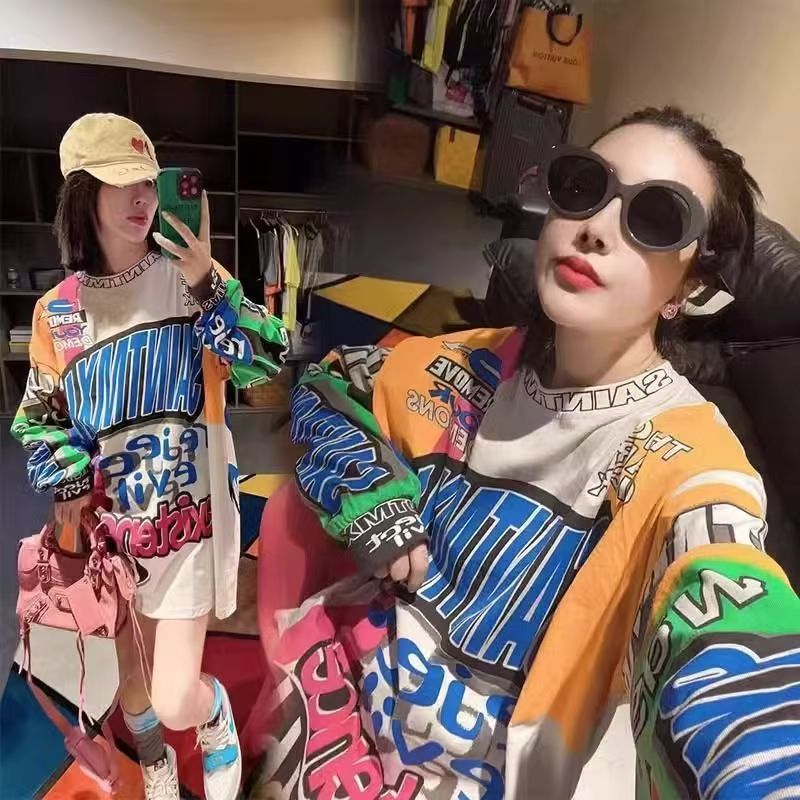 YF6908-图片色时尚大码字母个性涂鸦圆领长袖胖MM显瘦街头哈伦风上衣潮T