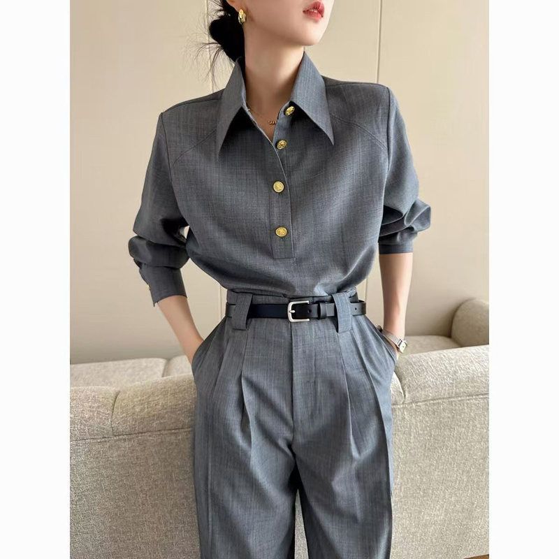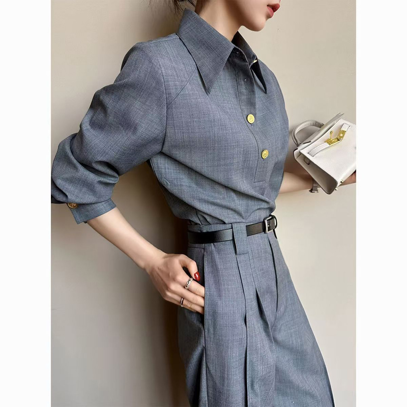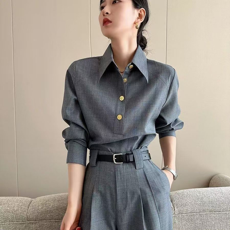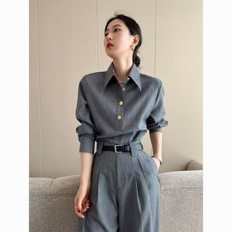 YF6910-图片色老钱风肌理纹长袖翻领系扣不规则裁剪设计春秋新款衬衣
