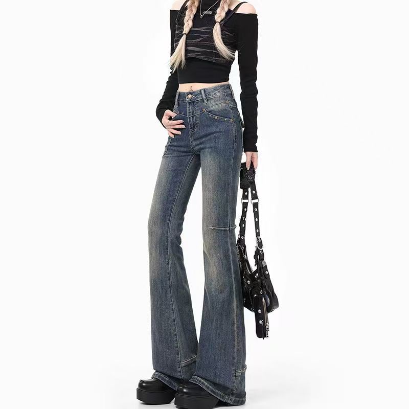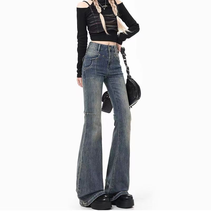 YF6913-图片色韩版小众复古微喇叭坠地感铆钉个性不对称口袋拼接牛仔裤