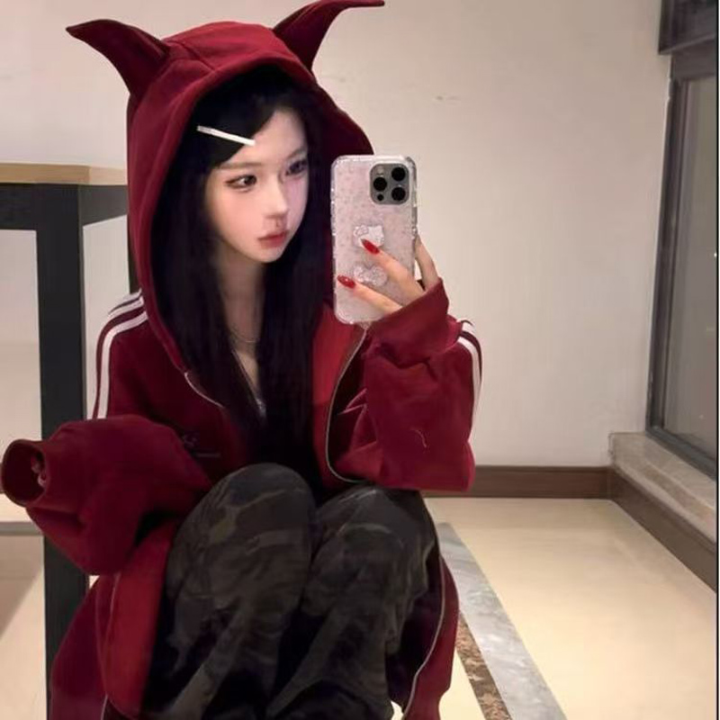 YF6915-图片色春秋复古风牛角帽子撞色条纹长袖拉链休闲百搭学院风卫衣潮