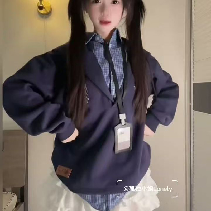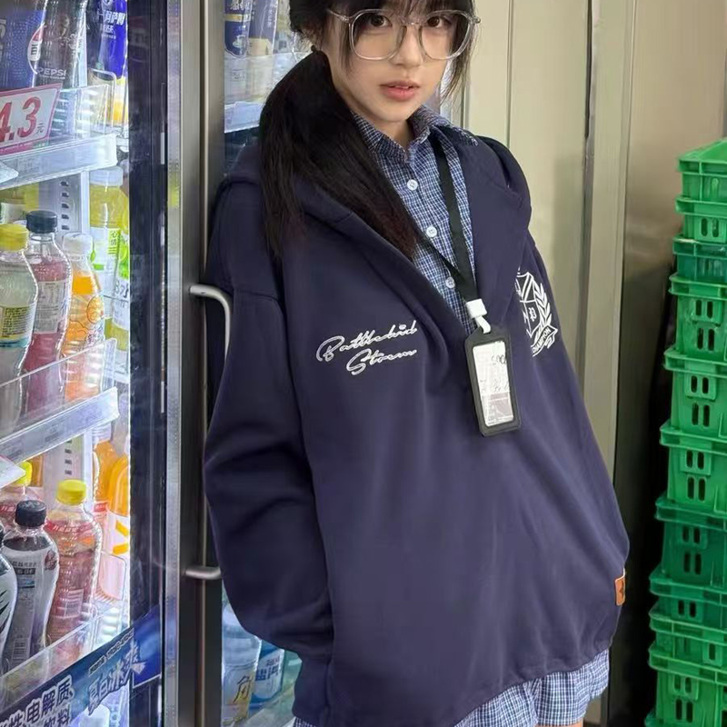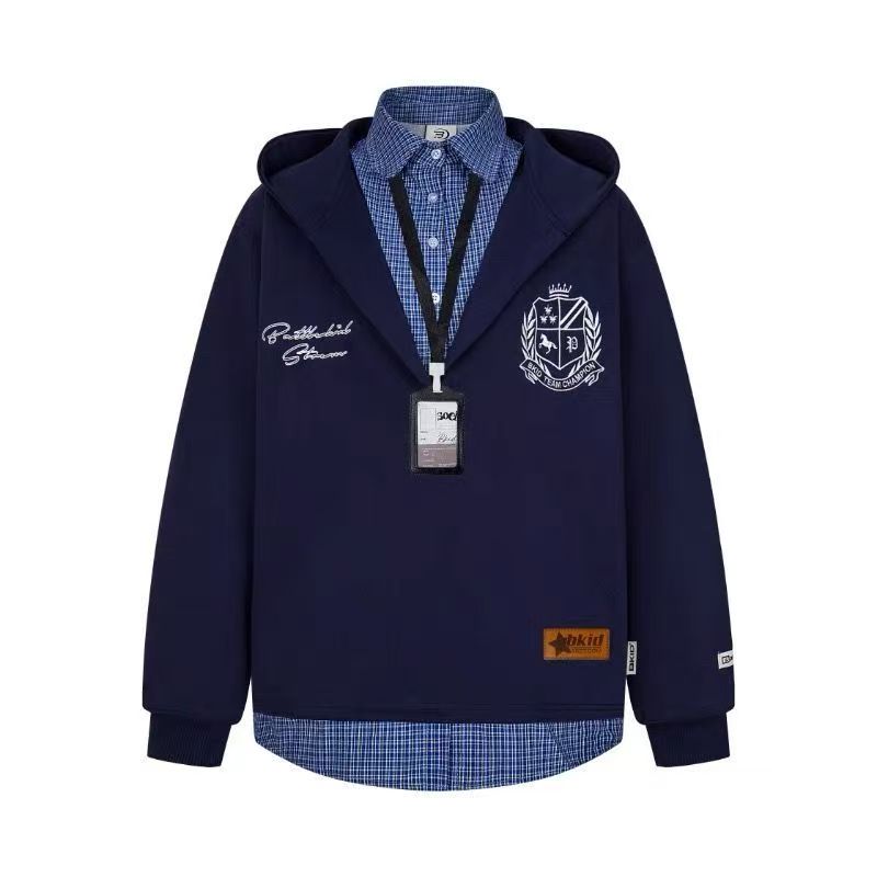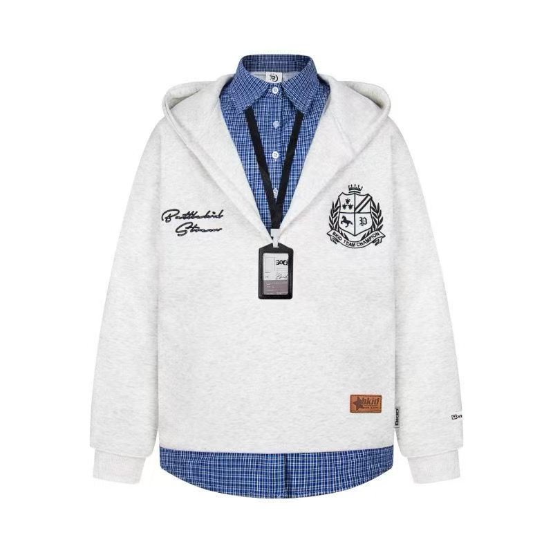 YF6916-(2色入内)假两件格子拼接长袖连帽字母徵章刺绣慵懒风春秋薄上衣