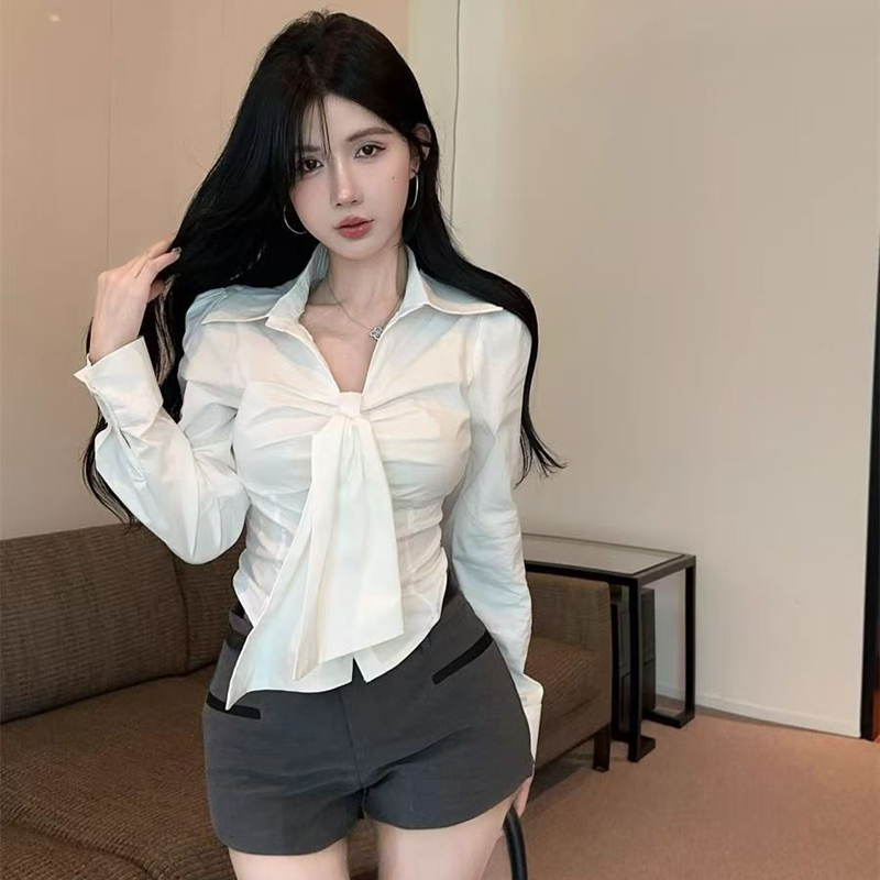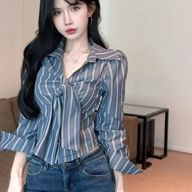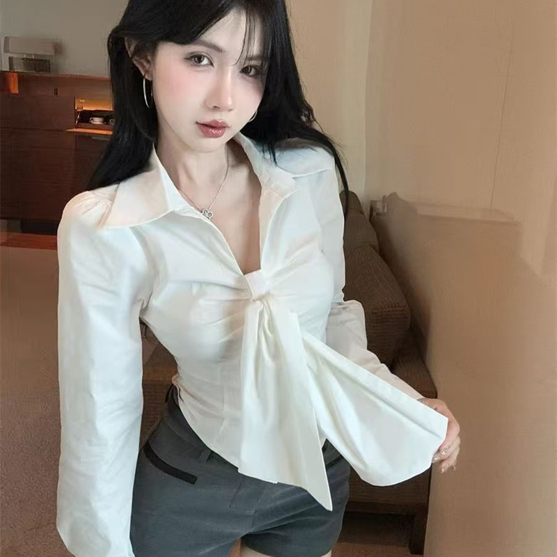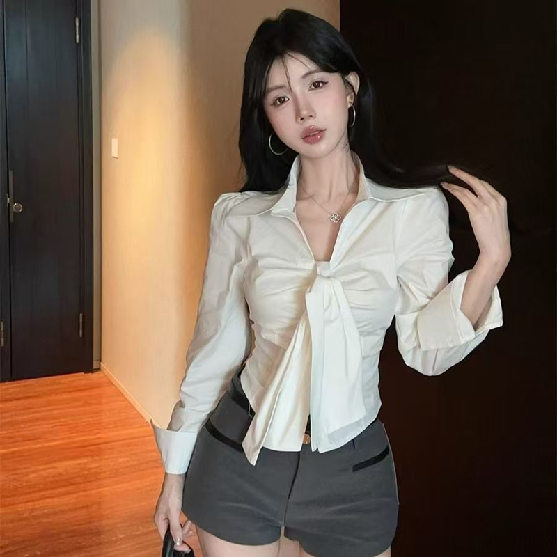 YF6920-(2色入内)甜美时尚POLO领长袖系蝴蝶结弧边修身短装显高别致个性衬衣