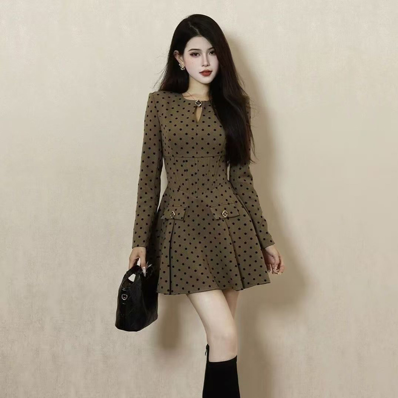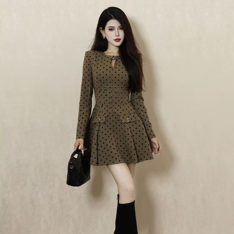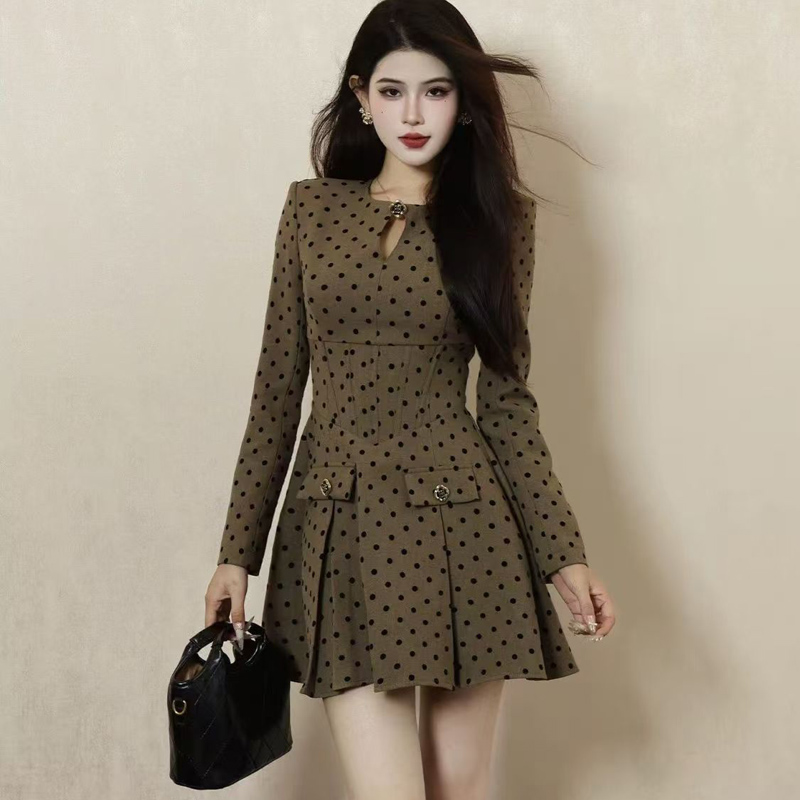YF3934-图片色甜美名媛气质长袖镂空系扣修腰拼接褶折感波点西装连衣裙