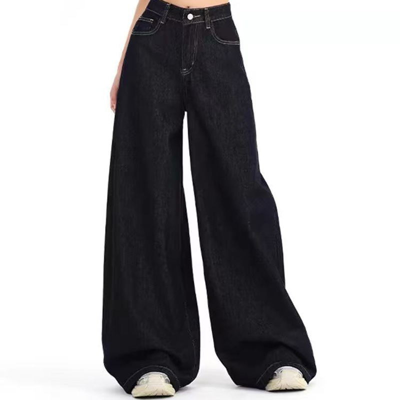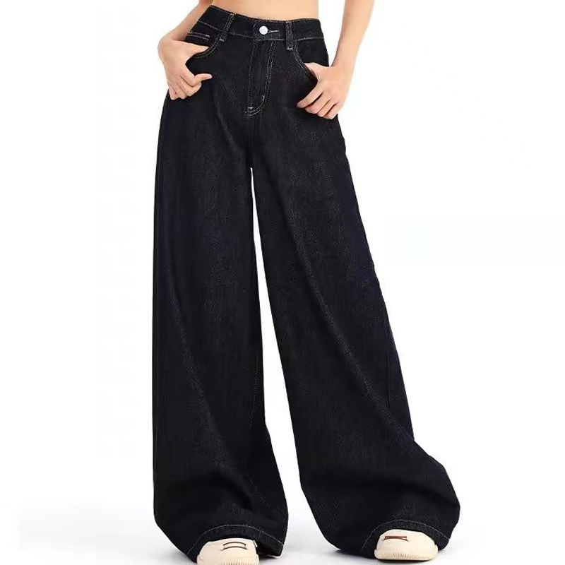 YF3639-图片色新款美式系扣高腰直筒坠地感阔腿大码慵懒风复古蓝牛仔裤