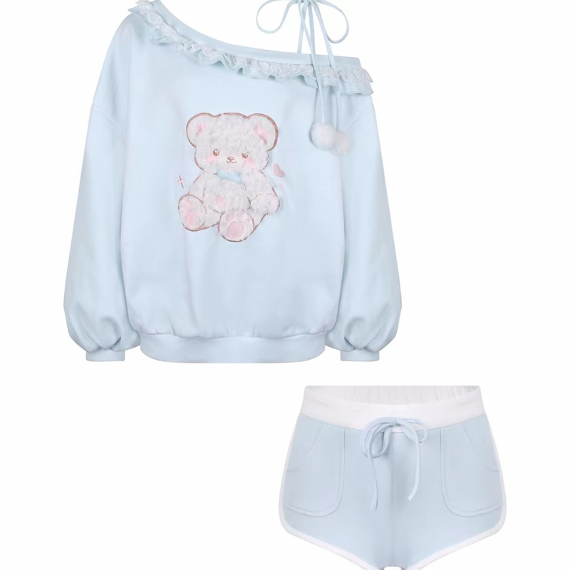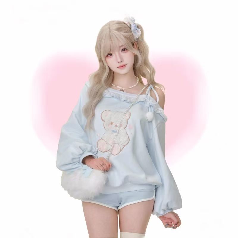 YF6943-图片色港式甜美时尚泡泡袖斜肩露肩荷叶边小熊刺绣宽松大码卫衣