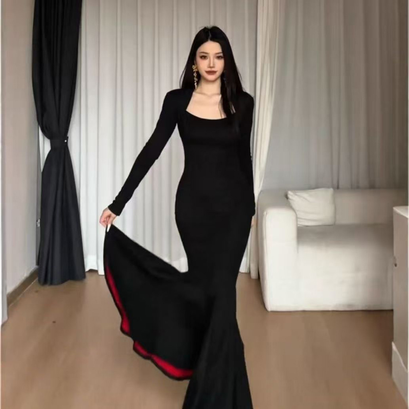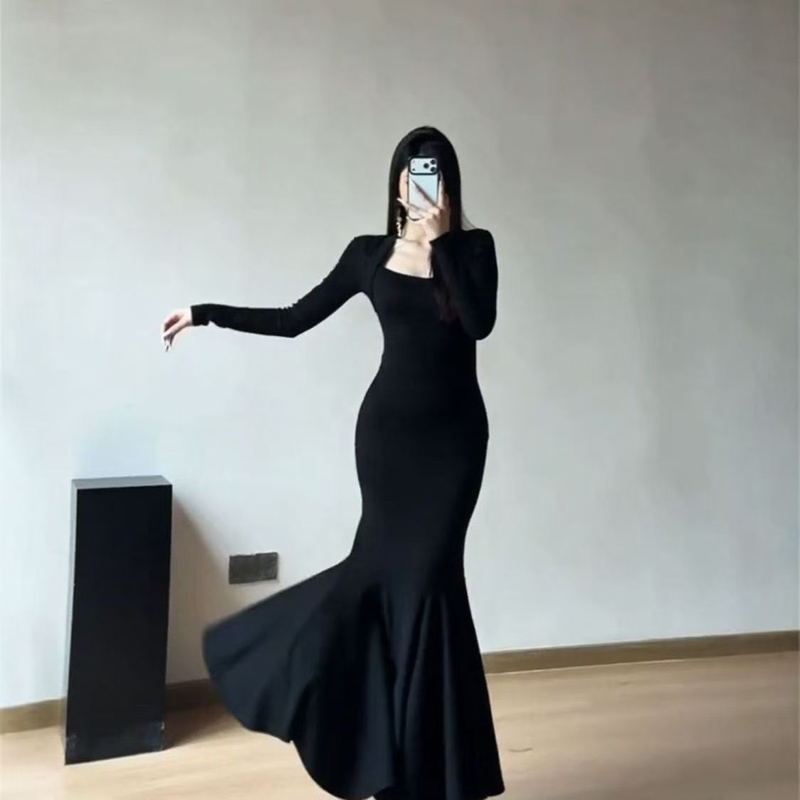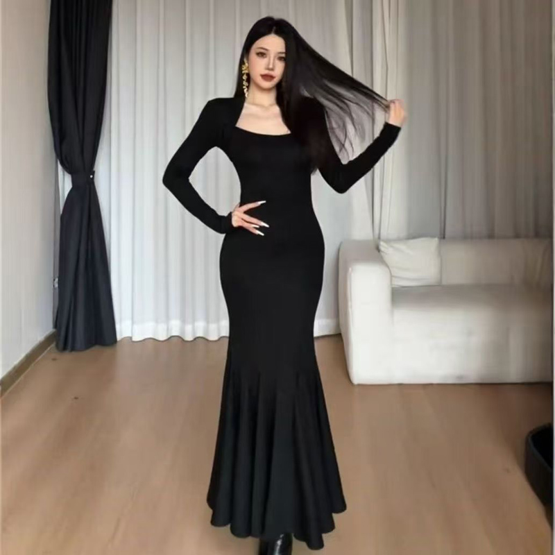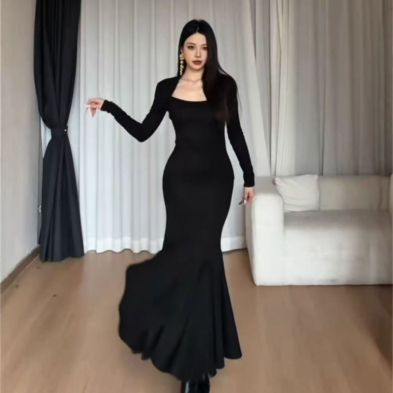 YF6944-图片色优雅时尚宴会气质长袖修腰包臀褶折鱼尾中长款连衣