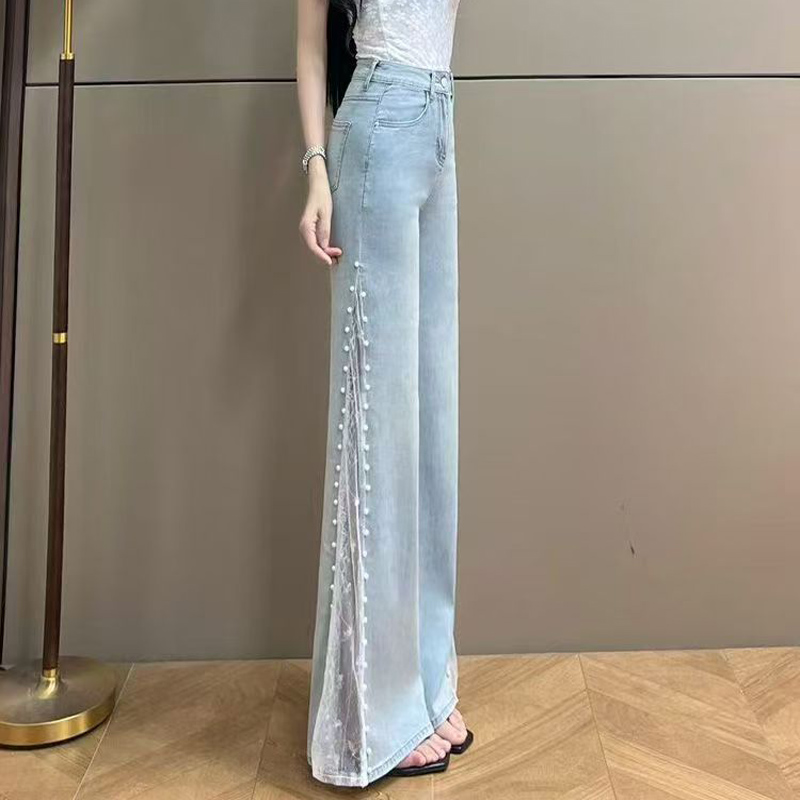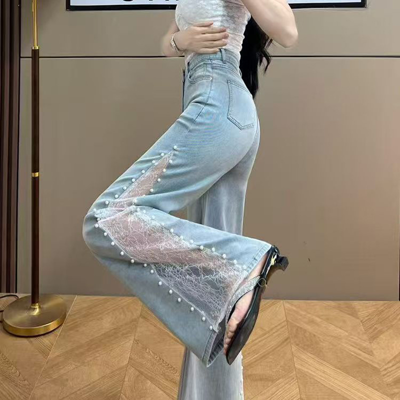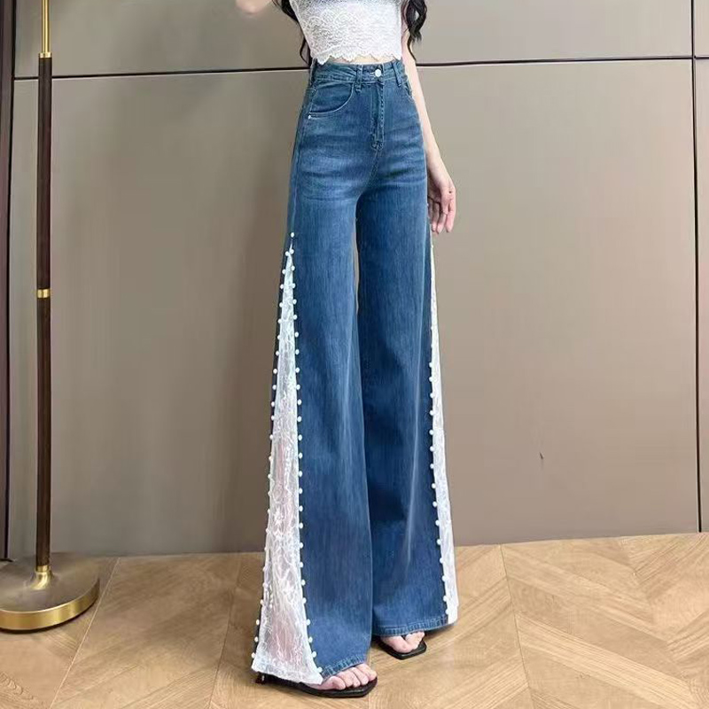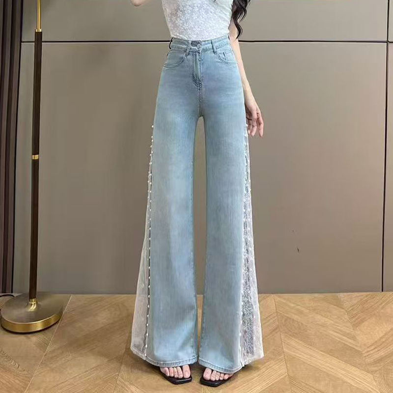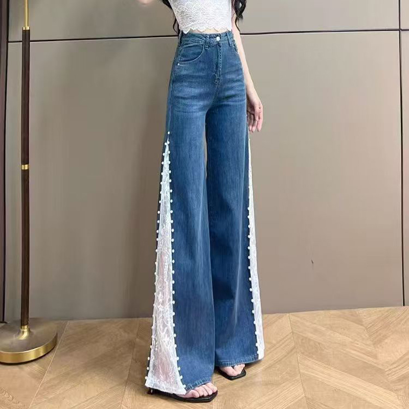 YF6948-(2色入内)港式辣妹微喇叭蕾丝拼接钉珠系扣高腰坠地感阔腿牛仔裤