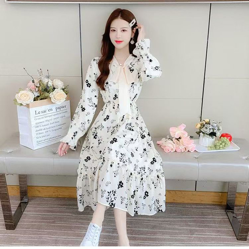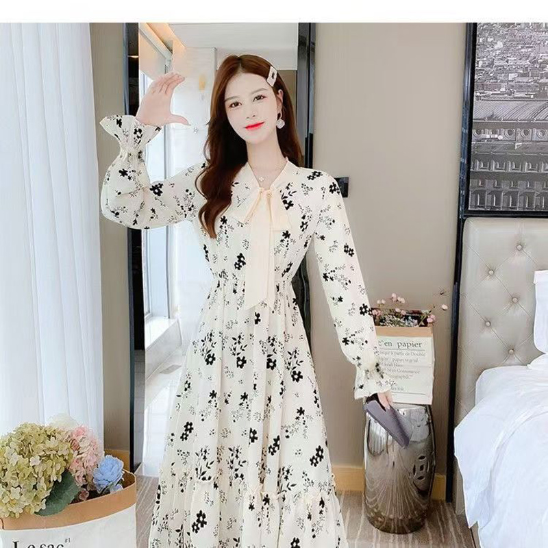 YF6949-图片色赫本春装长袖系蝴蝶结修腰碎花法式甜美气质雪纺连衣裙