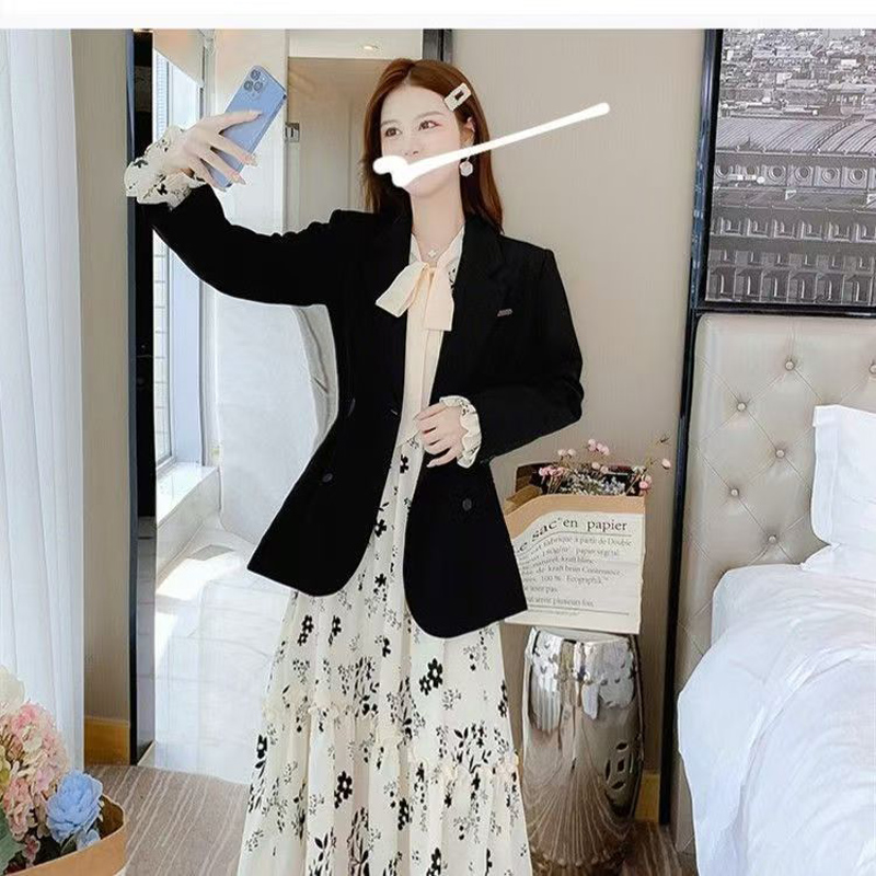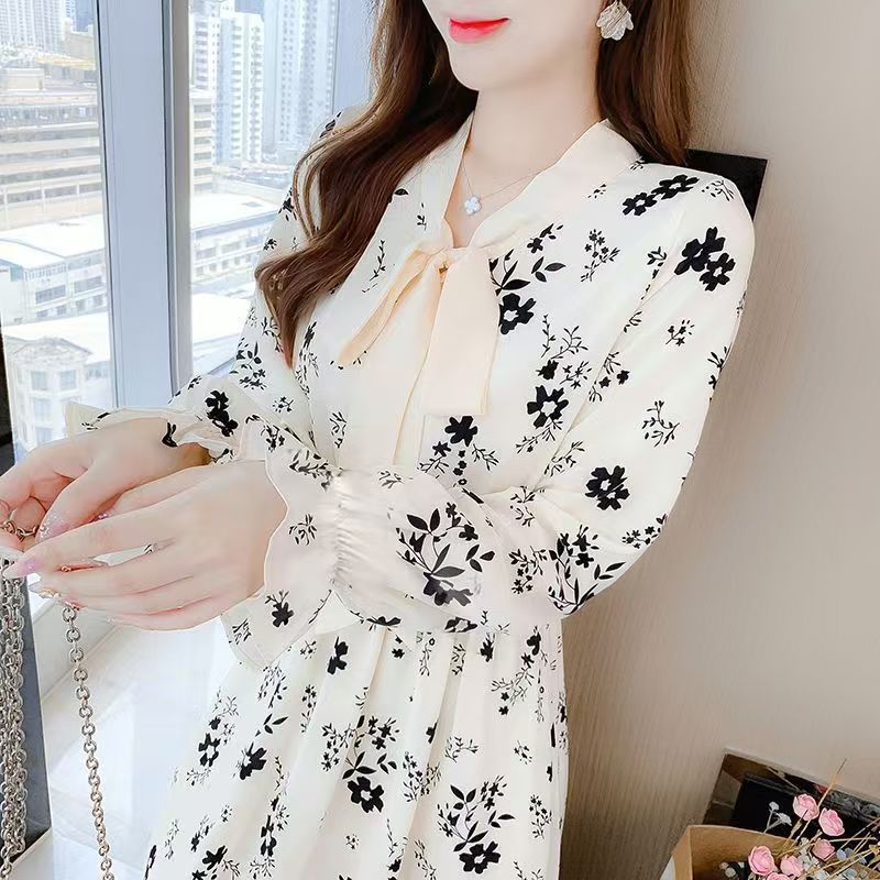 YF6949-图片色赫本春装长袖系蝴蝶结修腰碎花法式甜美气质雪纺连衣