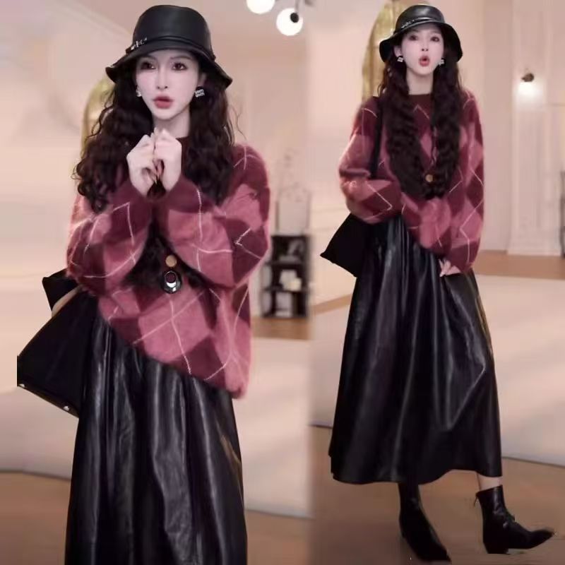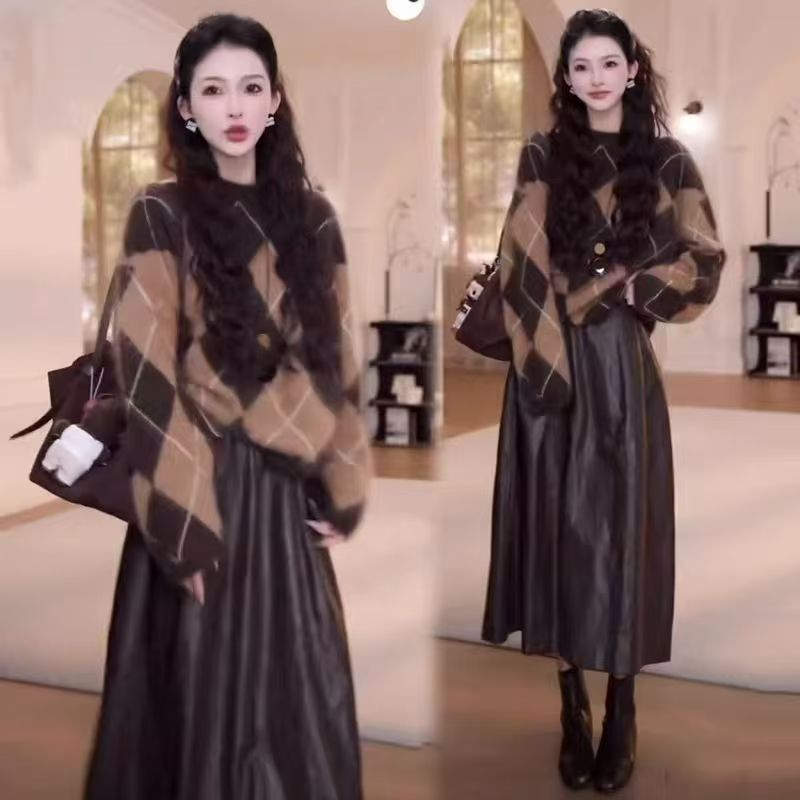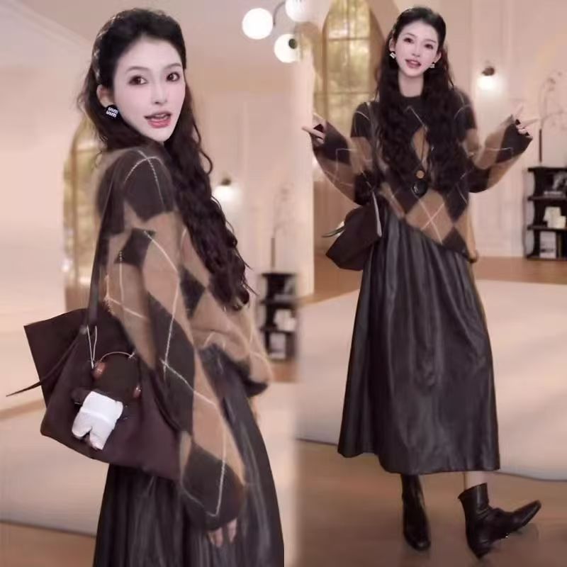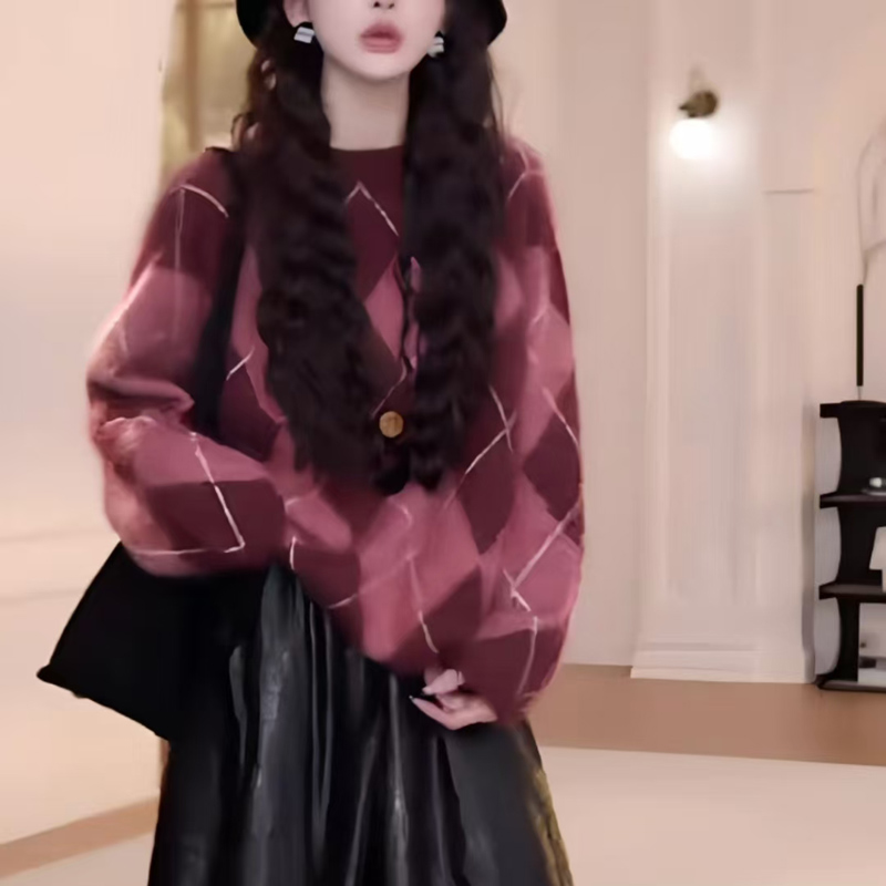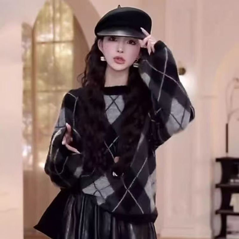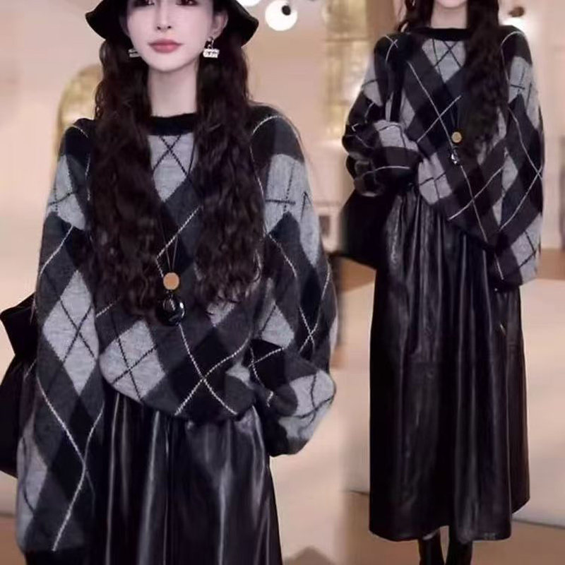 YF6951-(2色入内)秋冬复古格子撞色软糯舒适设计宽松大码显瘦慵懒风针织毛衣