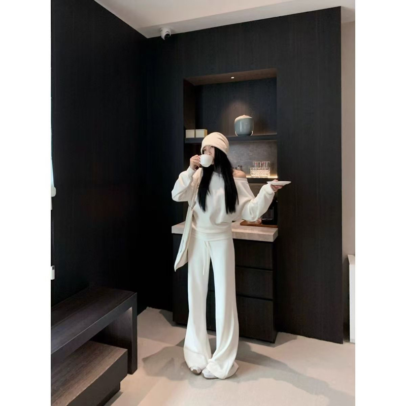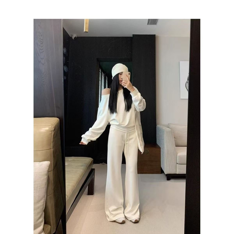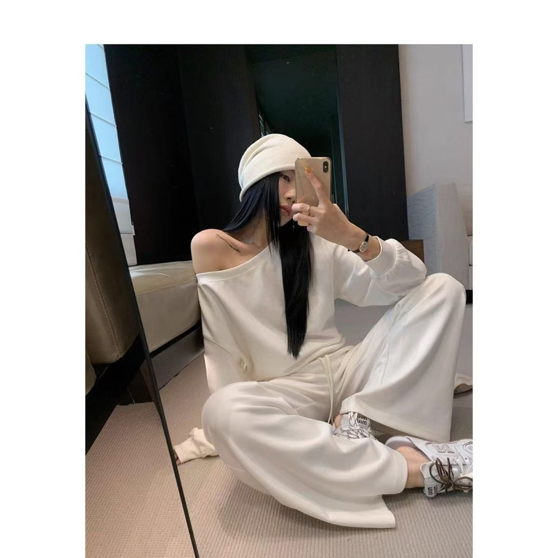 YF6952-图片色简约白色学院风露肩长袖宽松胖MM显瘦辣妹春秋百搭卫衣