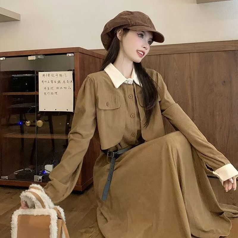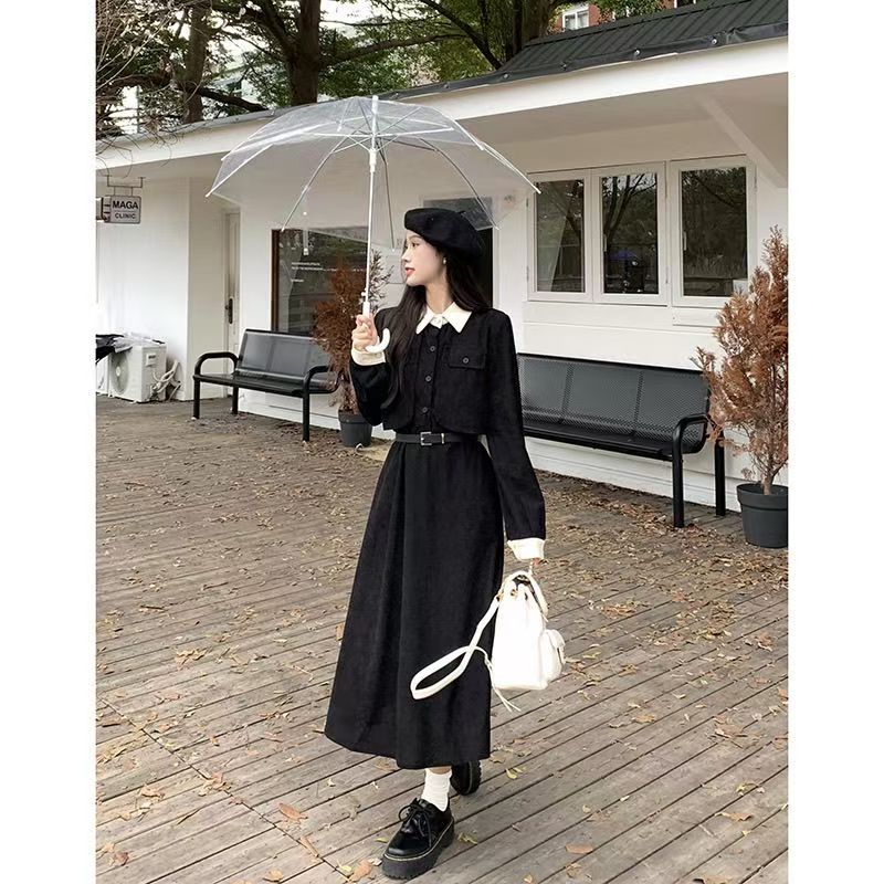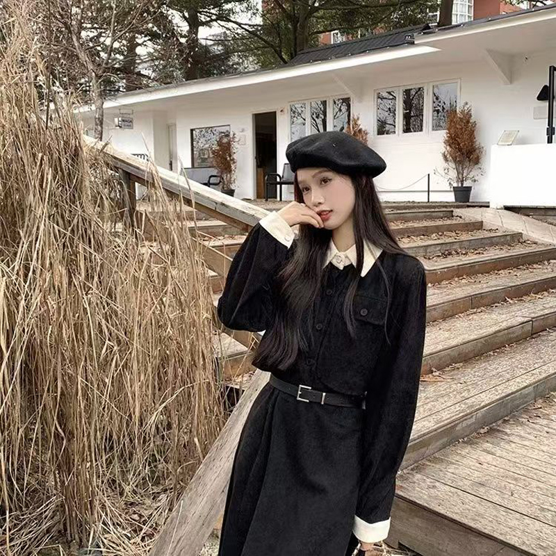 YF6953-(2色入内)假两件撞色翻领系扣荷叶边大摆法式甜美气质收腰灯芯绒连衣裙