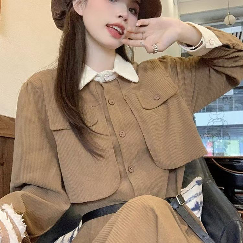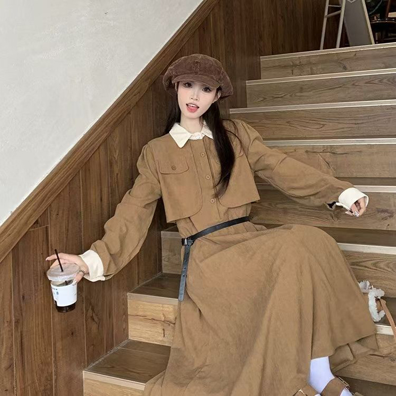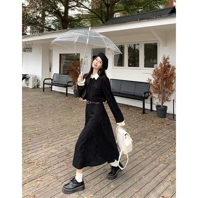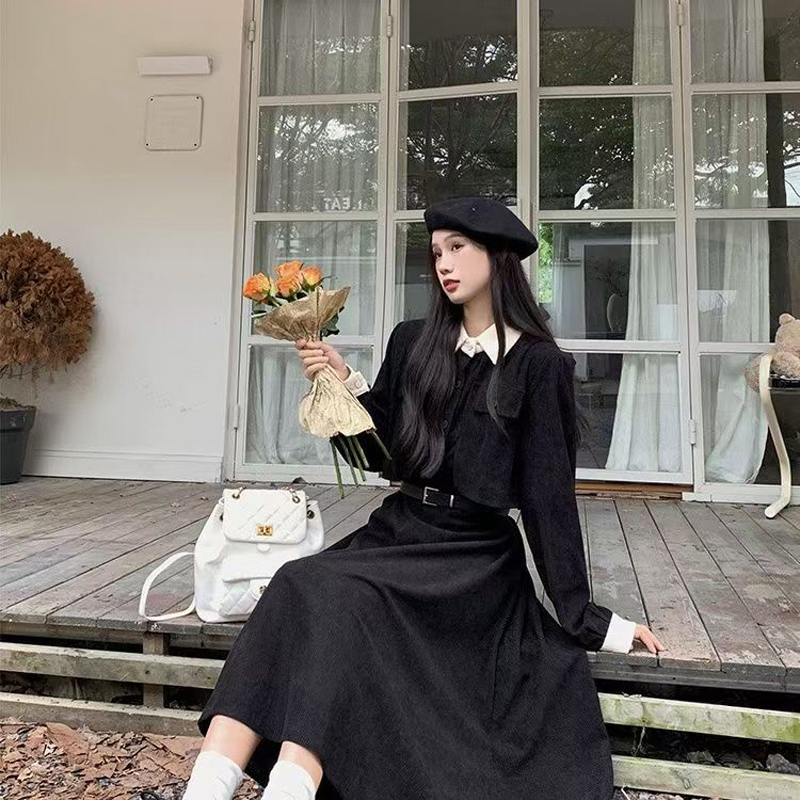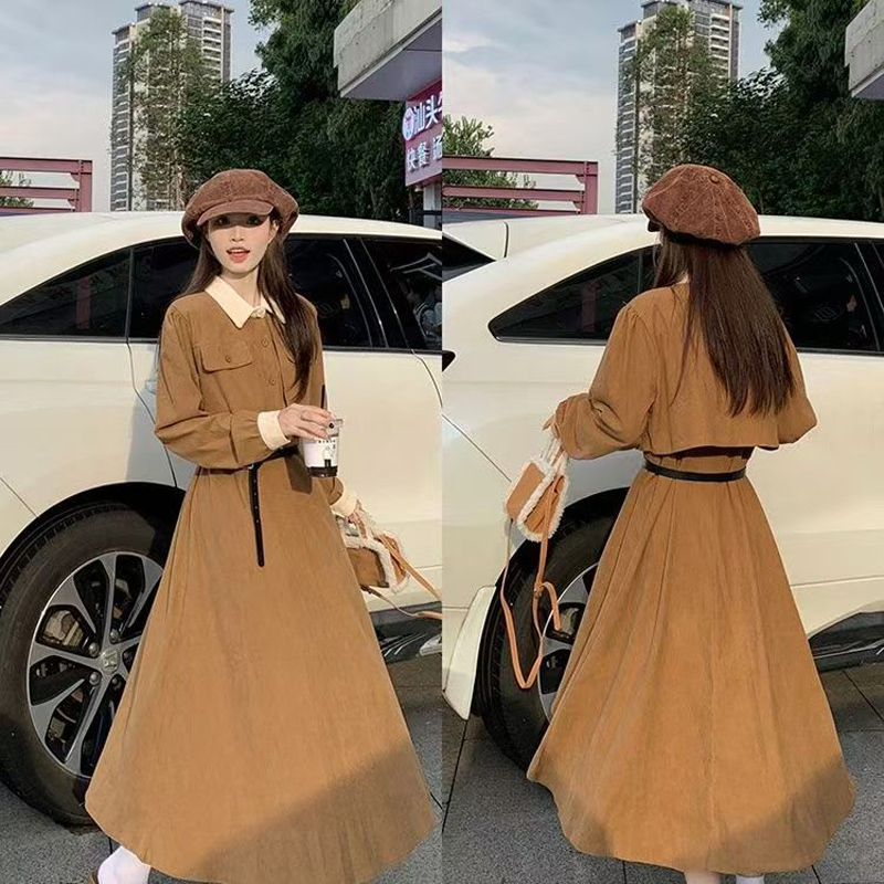YF6953-(2色入内)假两件撞色翻领系扣荷叶边大摆法式甜美气质收腰灯芯绒连衣