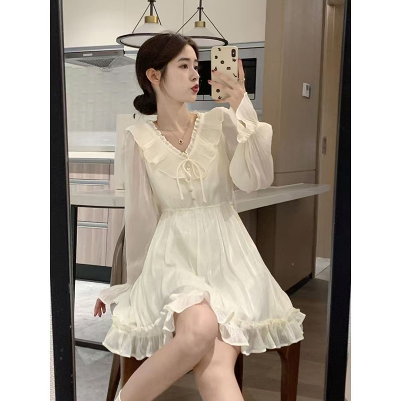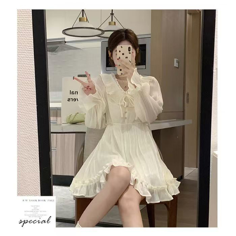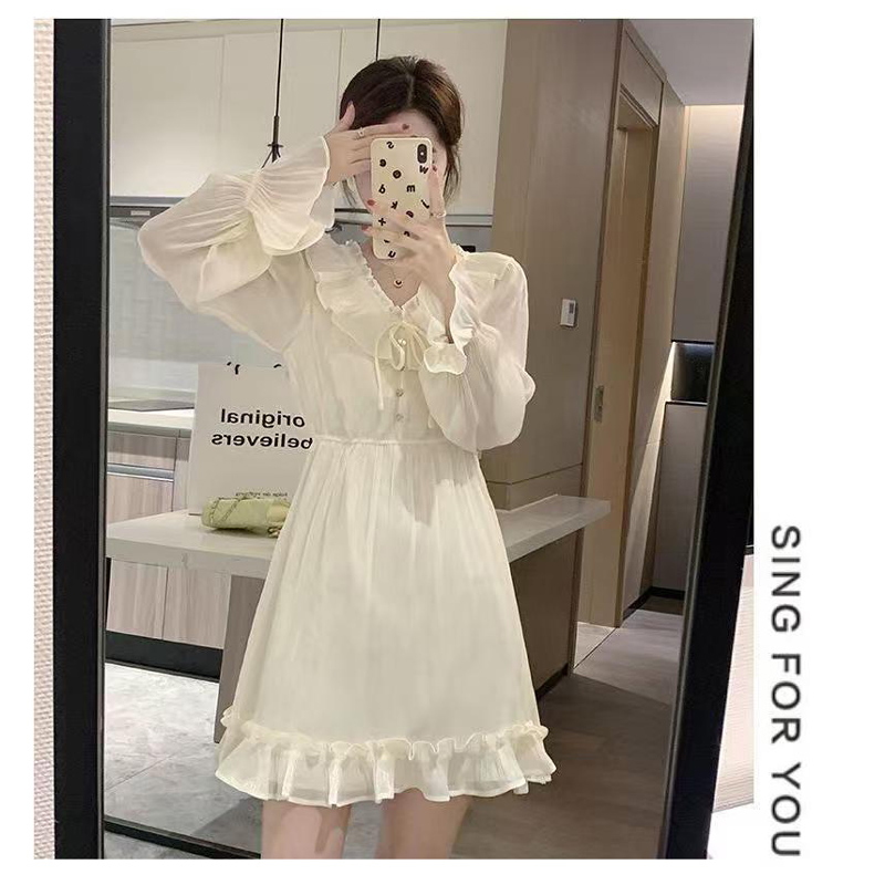 YF6954-图片色温柔风杏色仙女气质长袖荷叶边系蝴蝶结收腰坠地感雪纺连衣