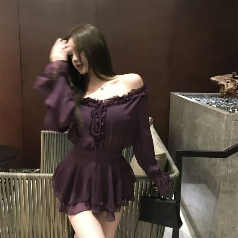 YF6956-图片色性感辣妹一字领荷叶边抽绳束腰显瘦洋气紫色头短装雪纺裙
