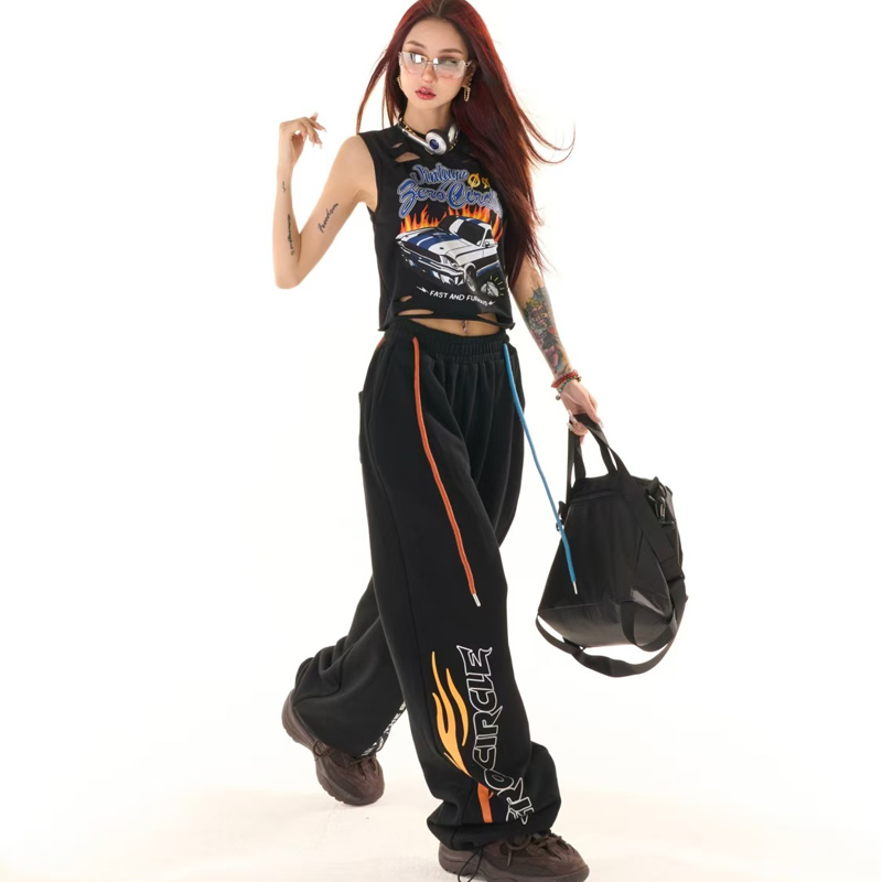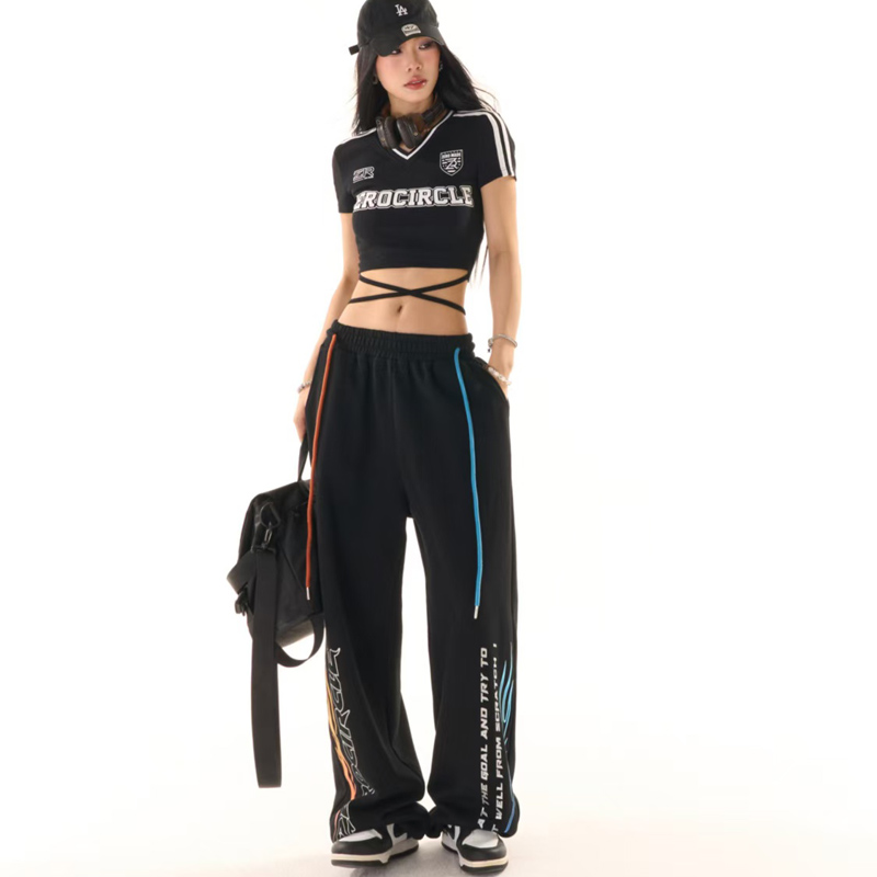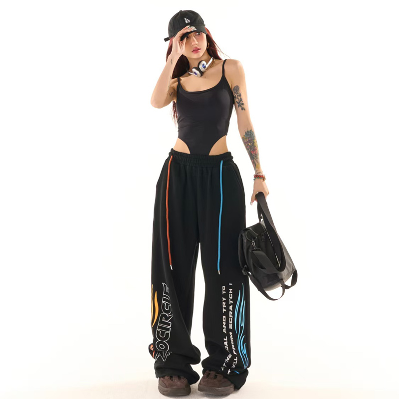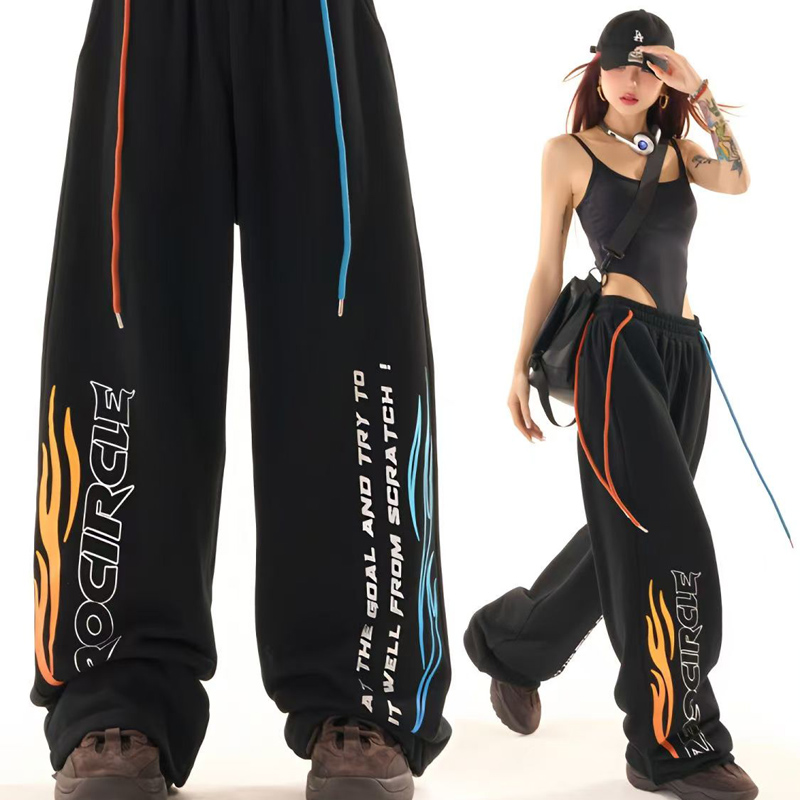YF6958-图片色原创新款松紧腰撞色绑绳字母印花动感设计阔腿运动卫衣裤