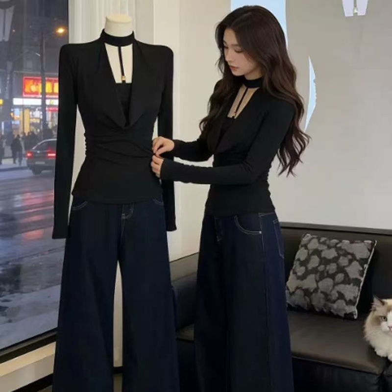 YF6964-图片色辣妹新款镂空围脖假两件拼接长袖弹力修身黑色休闲T恤