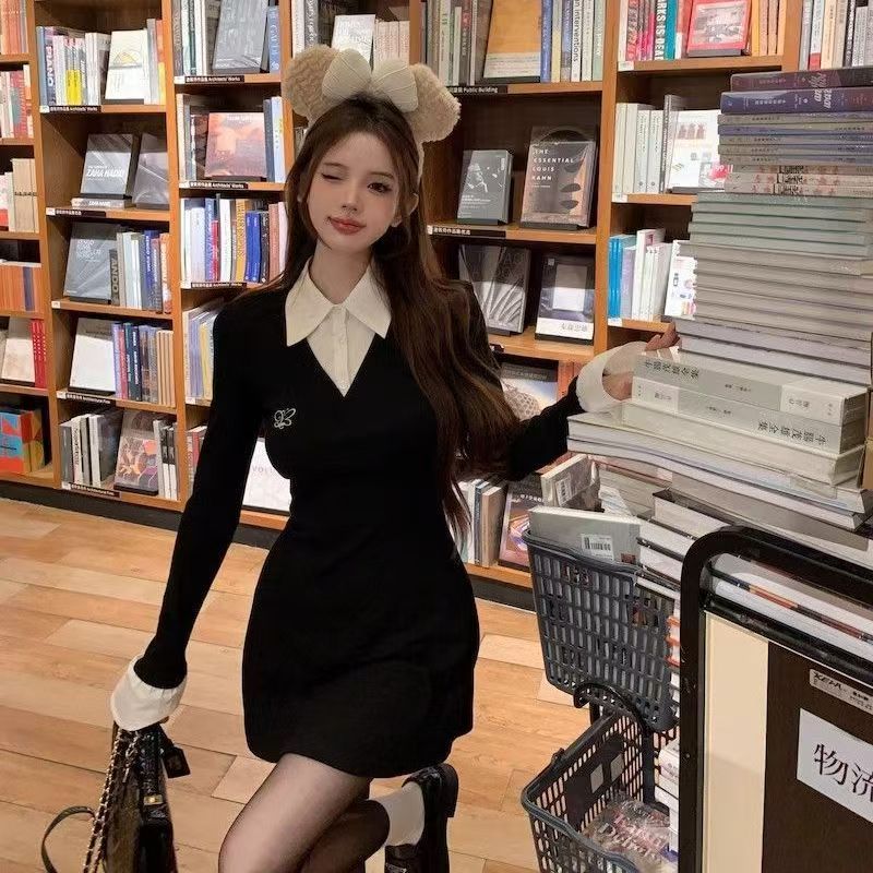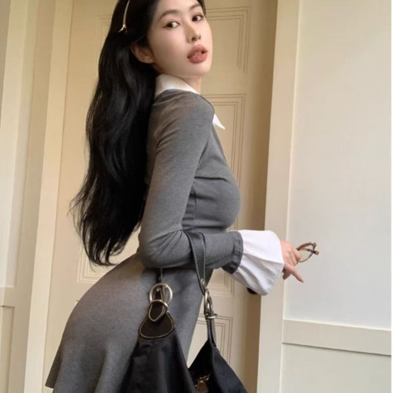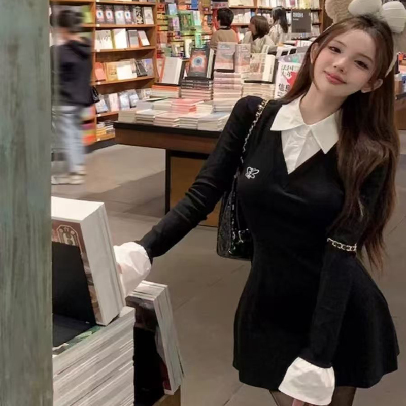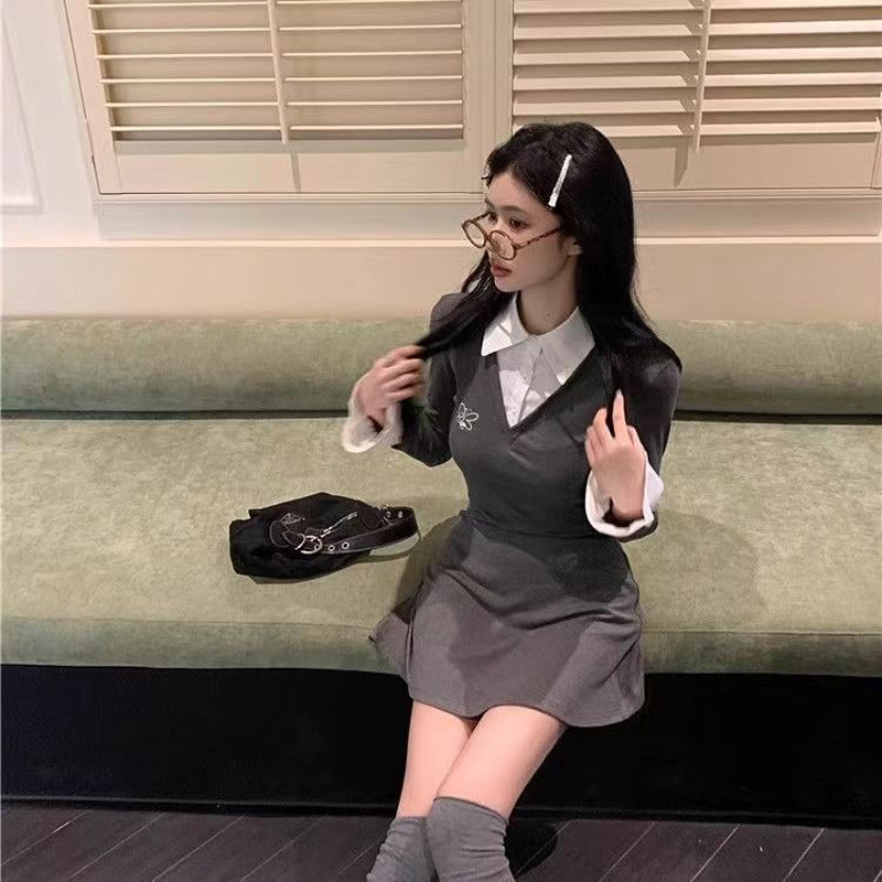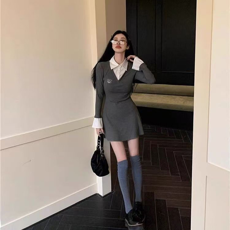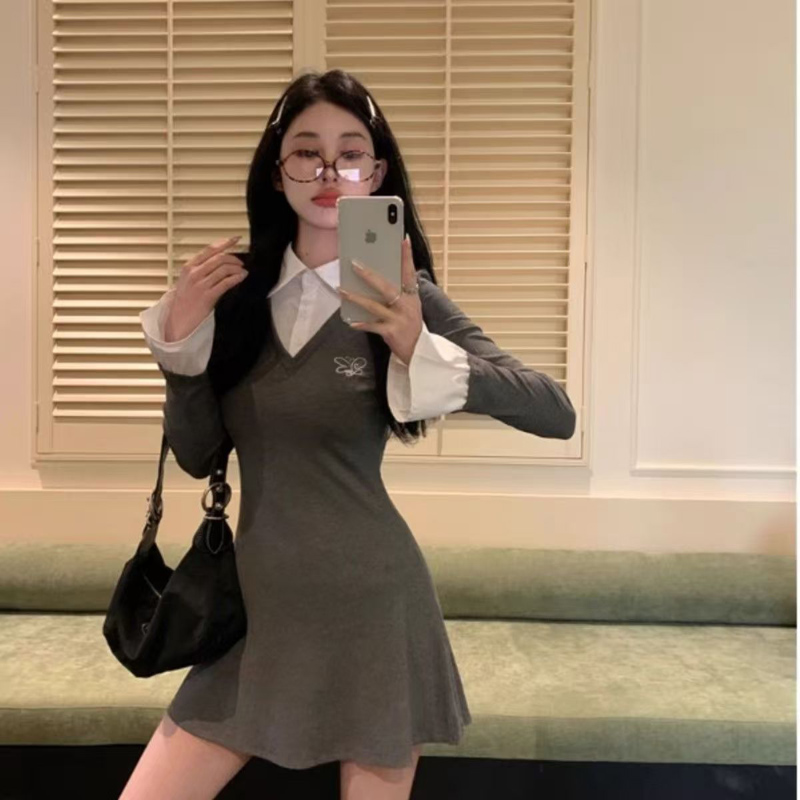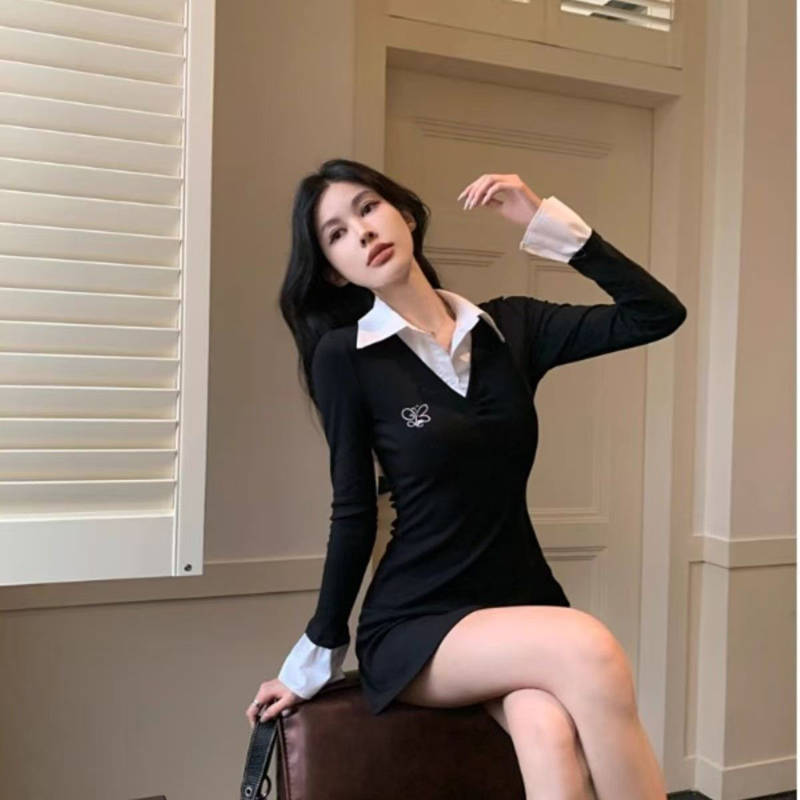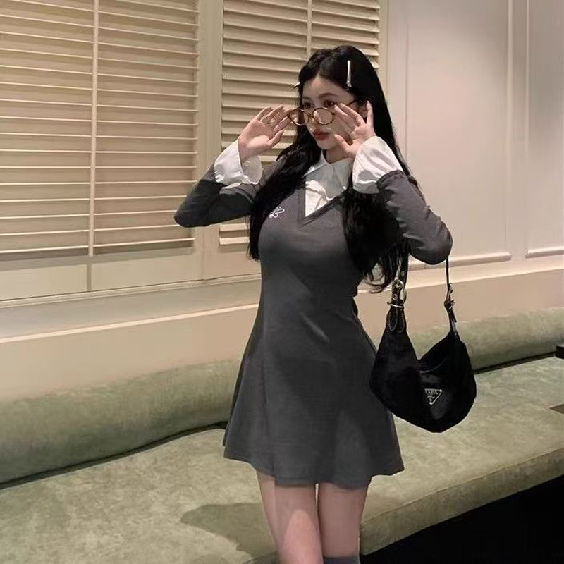 YF6965-(2色入内)春季假两件POLO领拼接V领字母刺绣修腰显瘦连衣裙