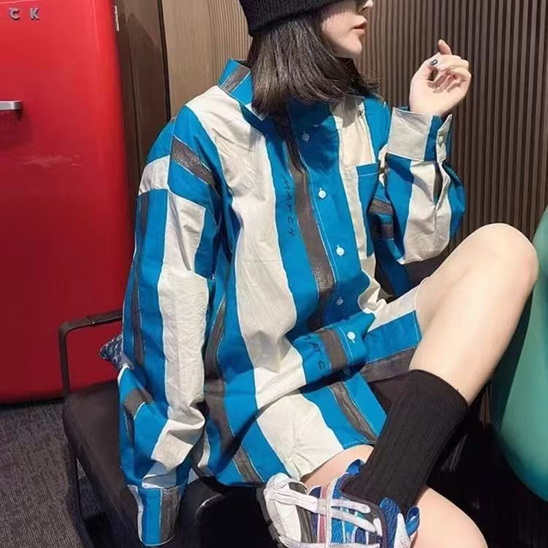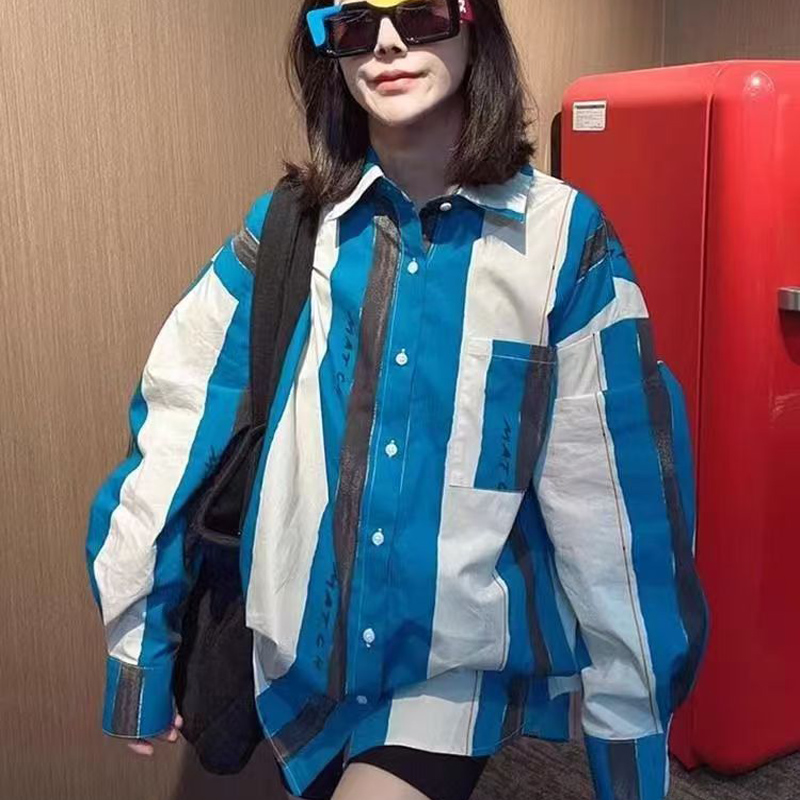 YF6971-图片色港式春季新款长袖翻领蓝白条纹胖MM显瘦慵懒风个性衬衣