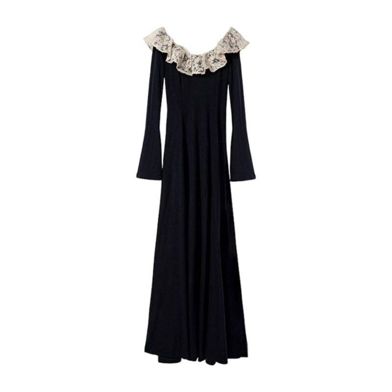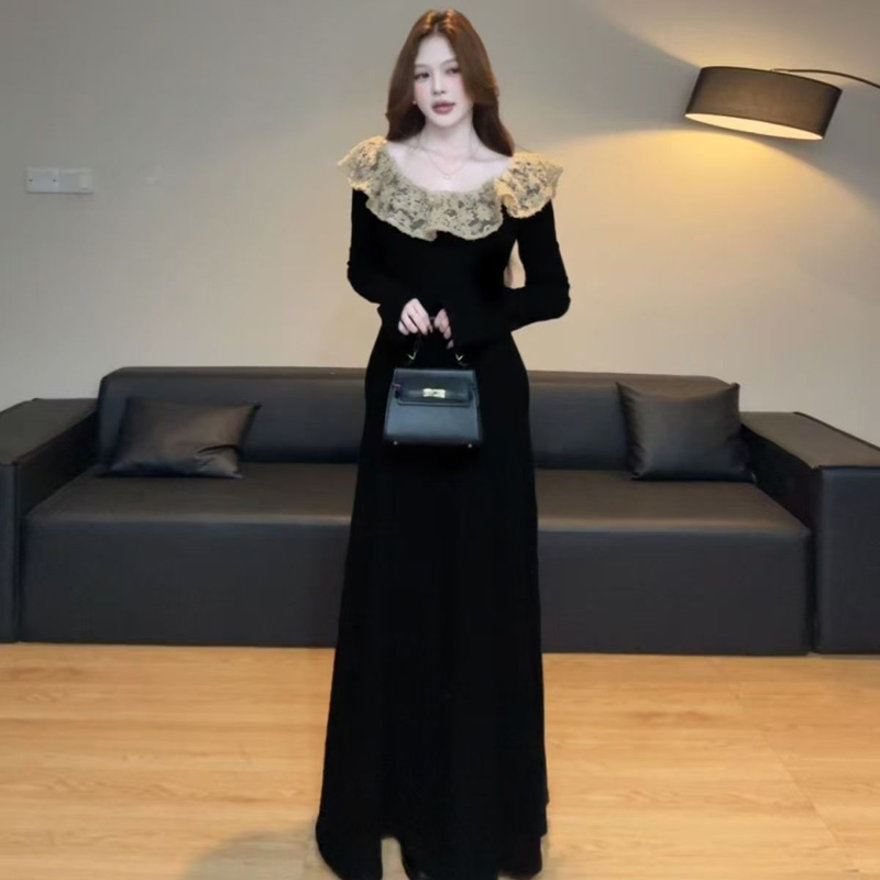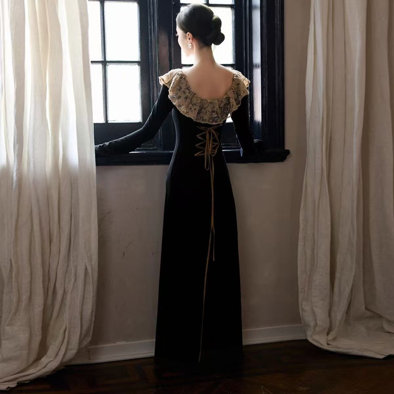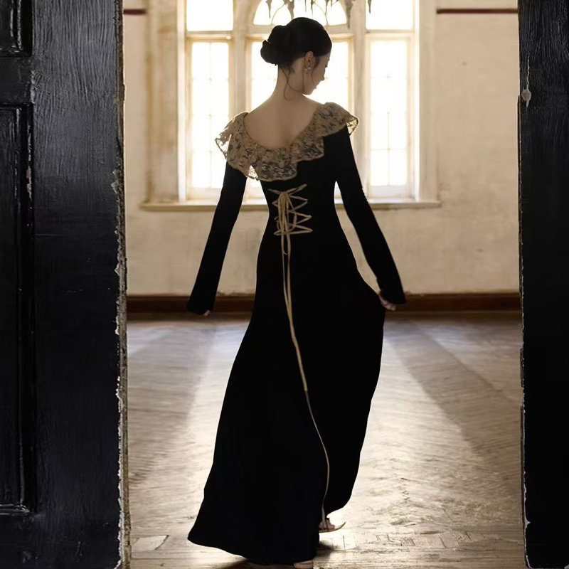 YF6974-图片色优雅时尚后背绑绳收腰显瘦蕾丝荷叶边赫本风黑色长裙