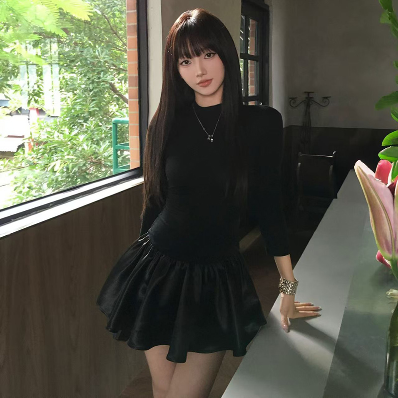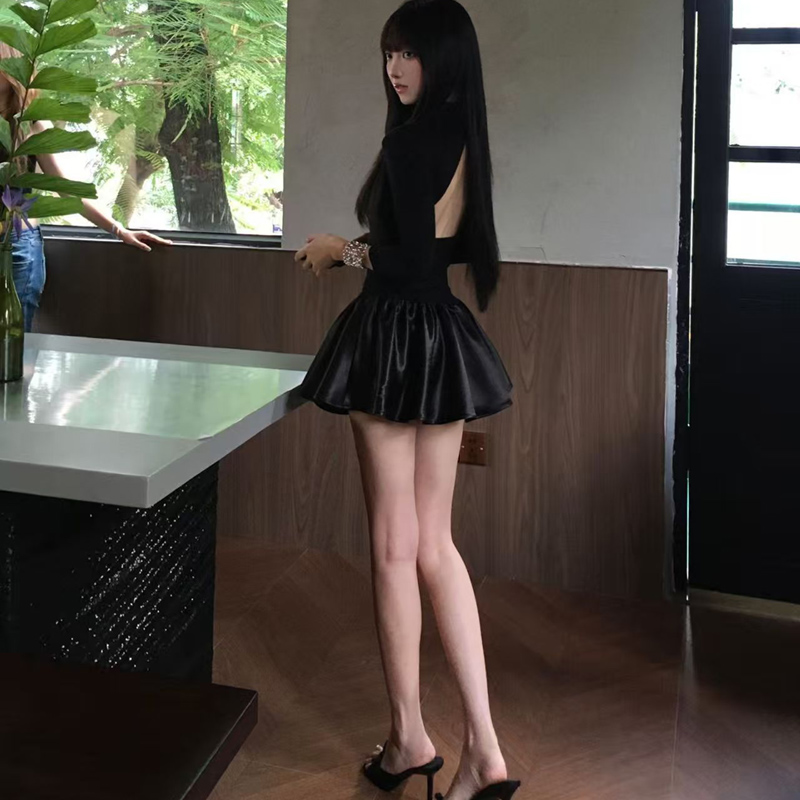 YF6976-(2色入内)韩版性感辣妹后背镂空缎面拼接修腰显瘦连衣裙