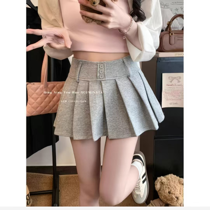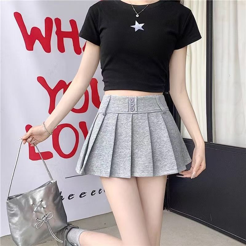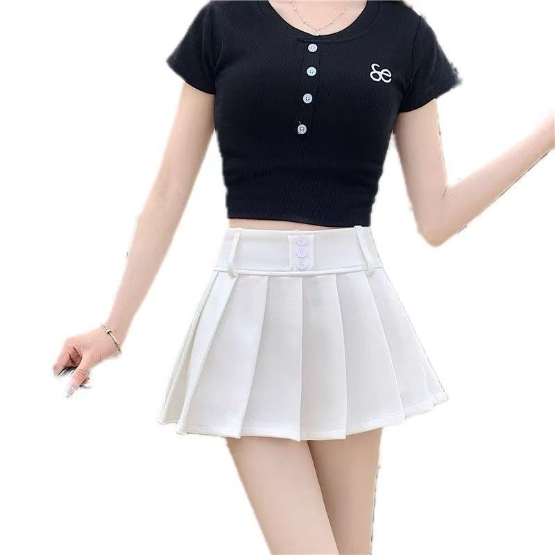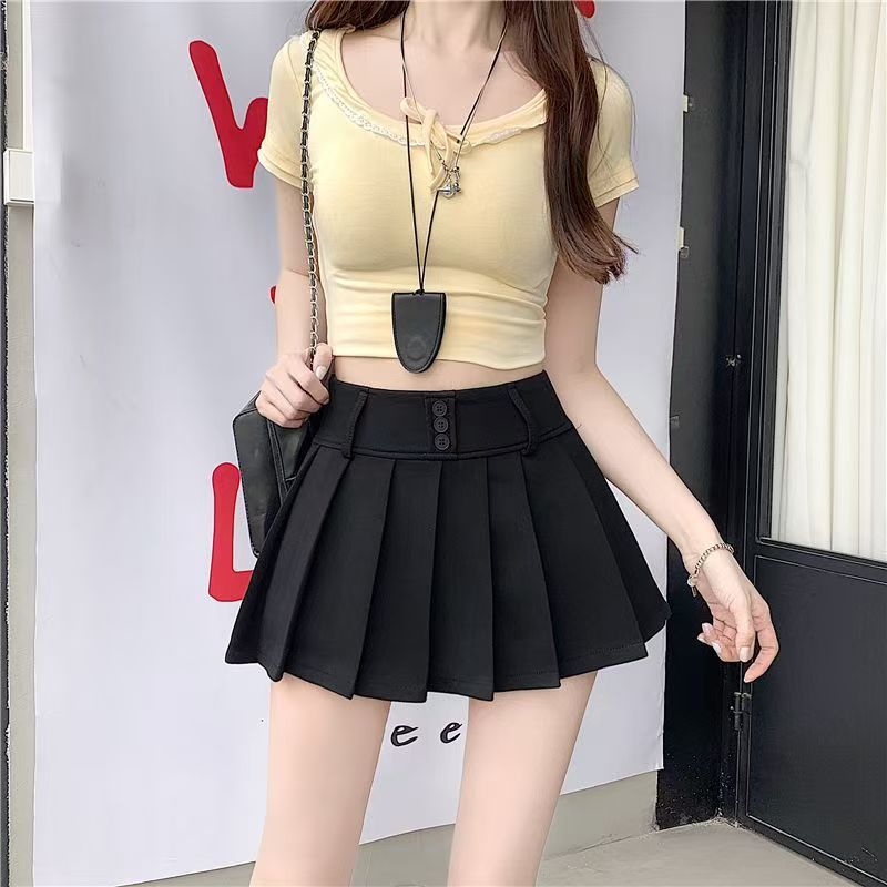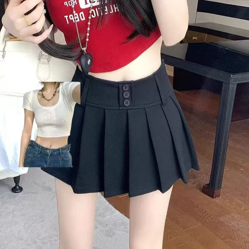 YF6977-(3色入内)性感小辣椒三颗扣高腰百褶A字防走光显瘦韩版半身裙