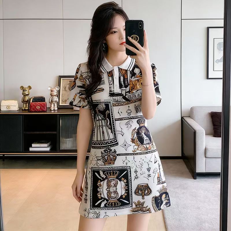 YF6980-图片色洋气个性漫画印花POLO领修身显瘦小个子设计感韩版连衣裙