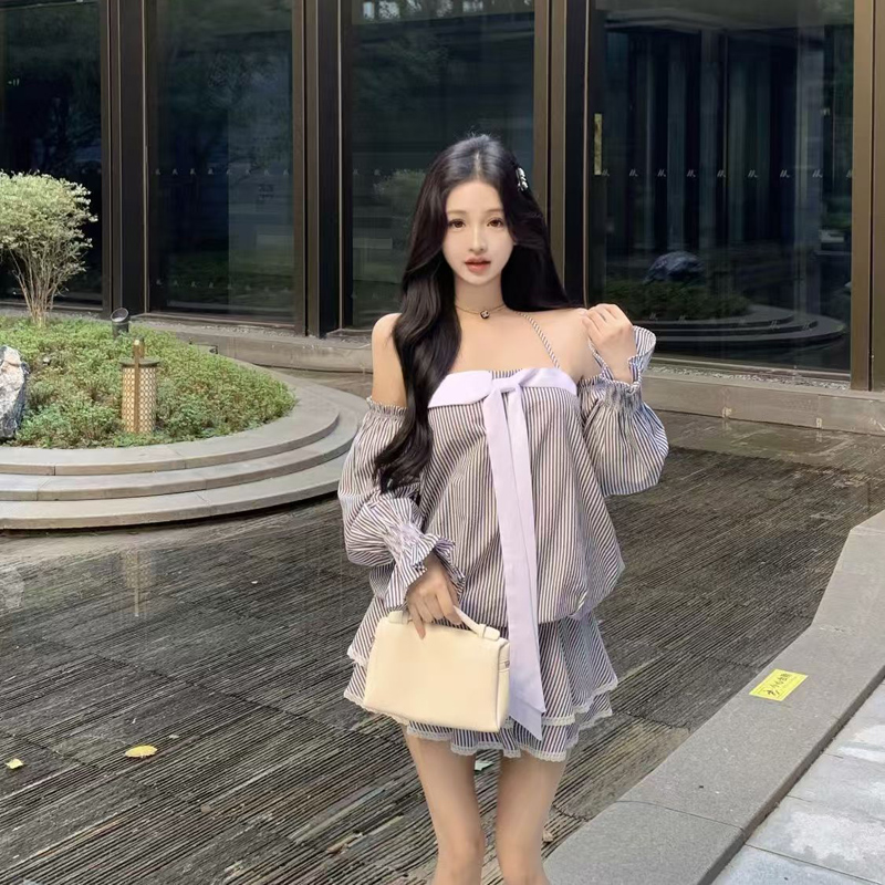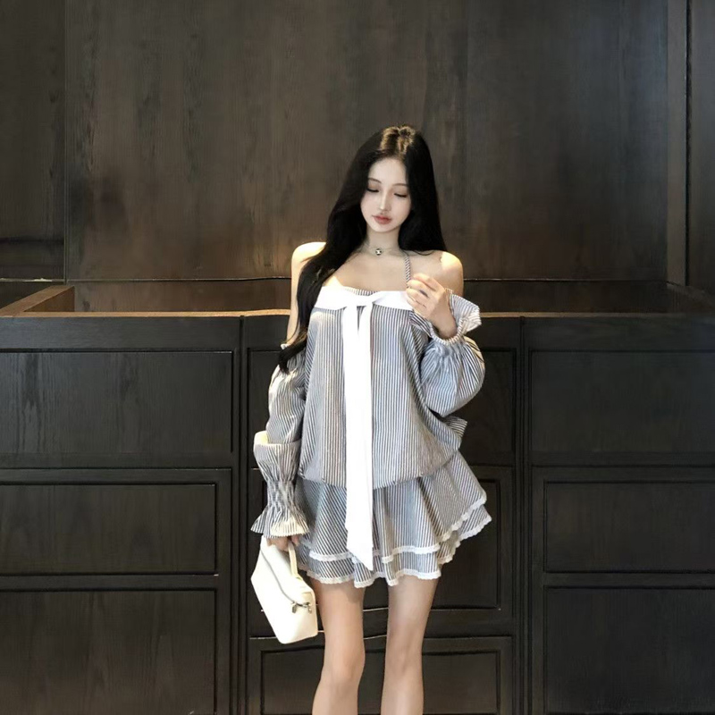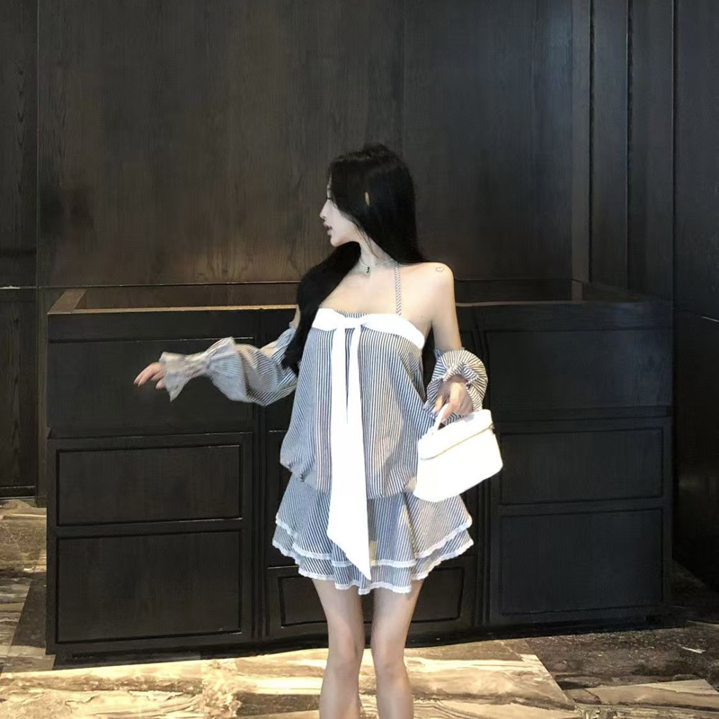 YF6981-图片色性感辣妹系蝴蝶结飘带松紧腰蓬蓬条纹长袖吊带抹胸连衣