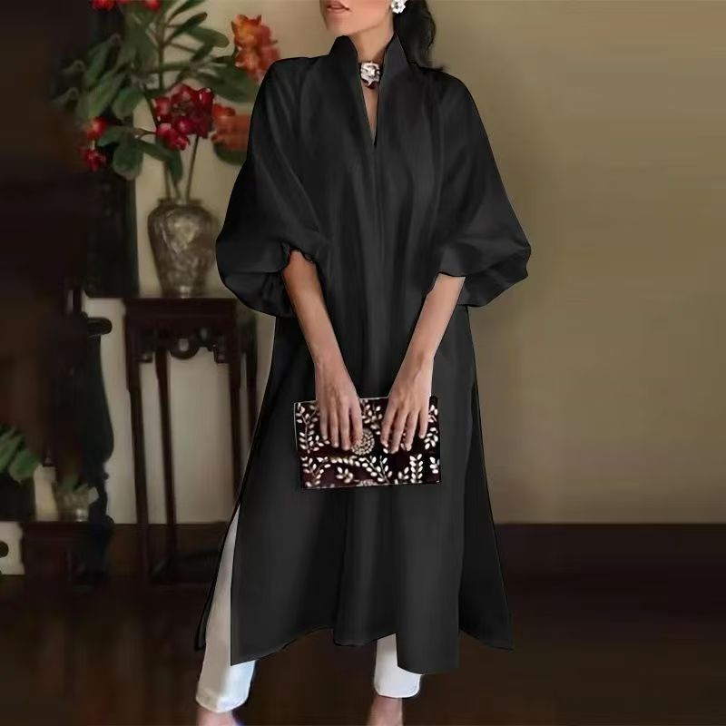 YF6983-(4色入内)外贸时尚灯笼袖立领宽松显瘦开叉纯色春季新款连衣裙