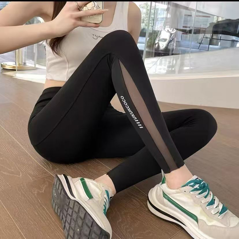 YF6985-(3色入内)性感辣妹弹力紧身提臀收腹高腰字母印花网纱拼接打底芭比裤