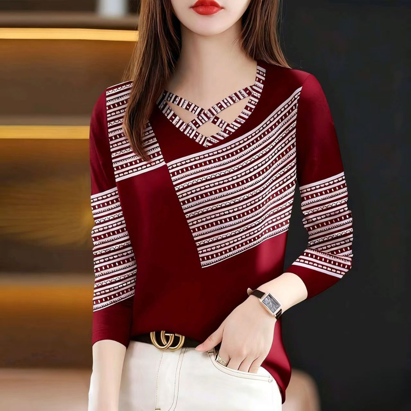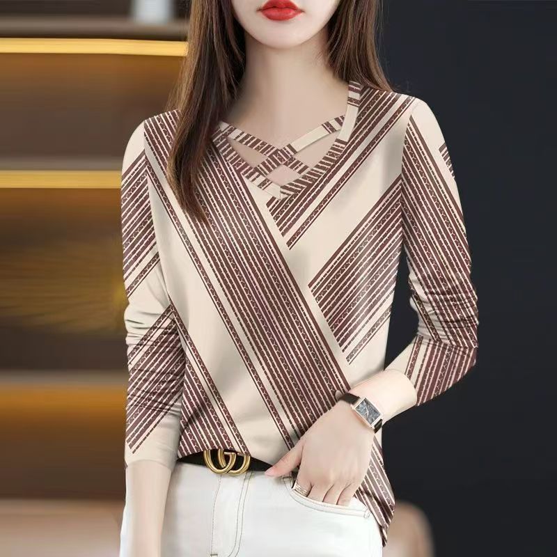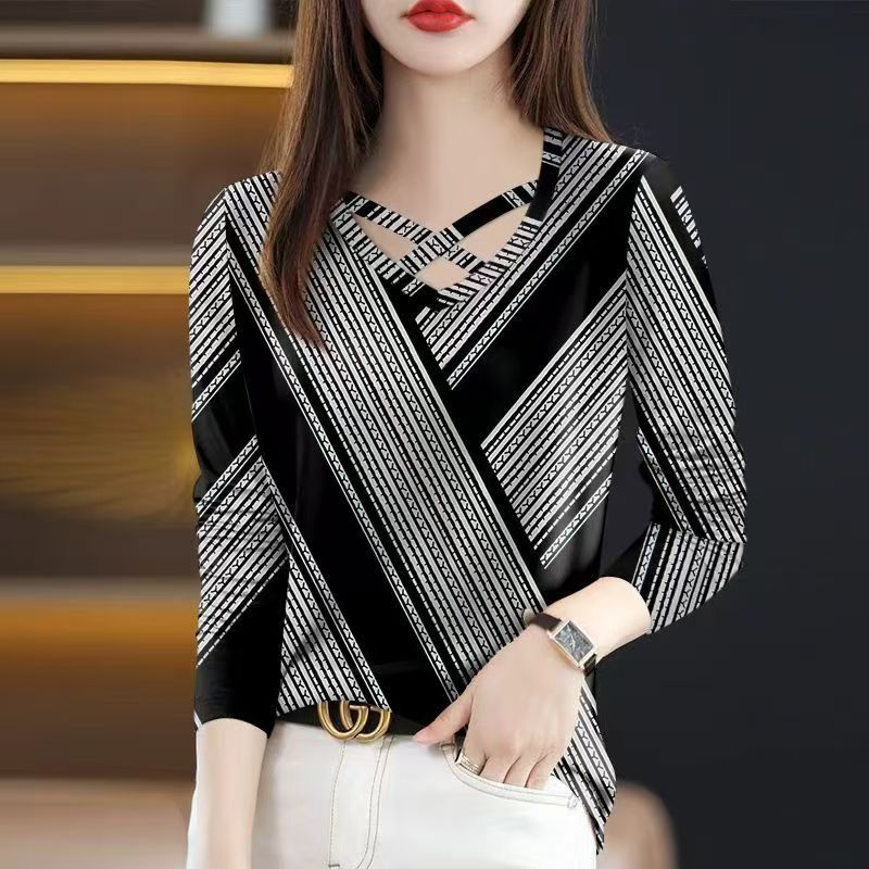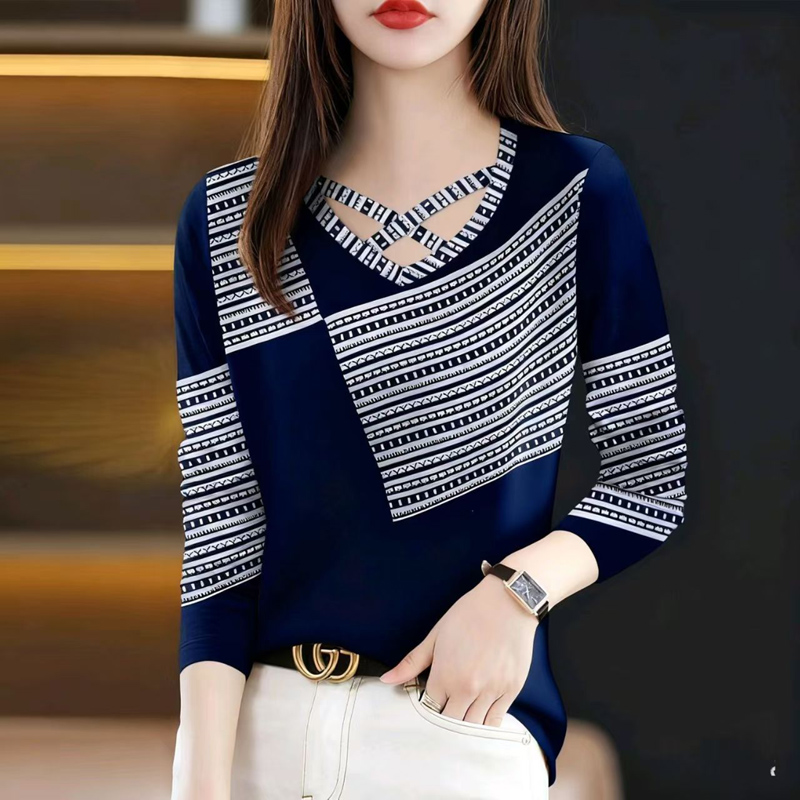 YF6990-(4色入内)春秋洋气新款长袖交叉圆领撞色条纹拼图感印花设计感休闲T恤
