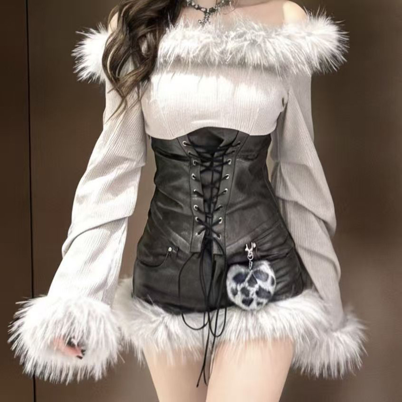 YF6992-(2色入内)纯欲风一字肩开叉绑绳假两件包臀长袖抹胸收腰紧身礼服裙