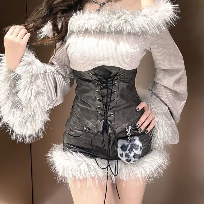 YF6991-图片色辣妹性感高腰包臀毛毛围边紧身小众设计PU皮拼接短裤
