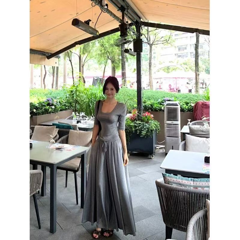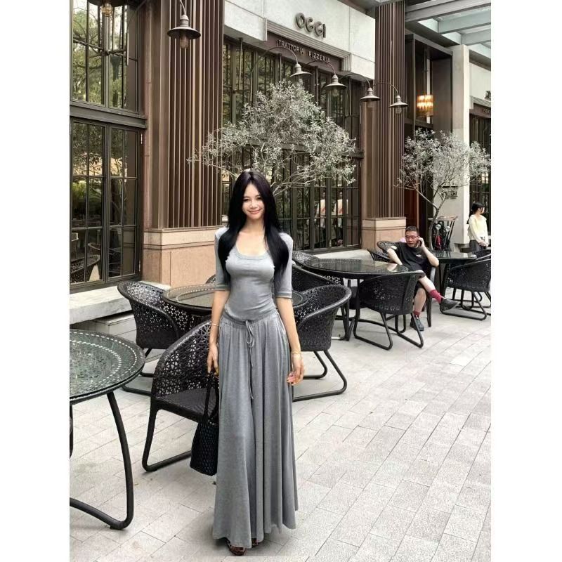 YF6993-(2色入内)2026春装新款简约圆领短袖弹力T恤搭松紧腰绑绳阔腿休闲两件套装