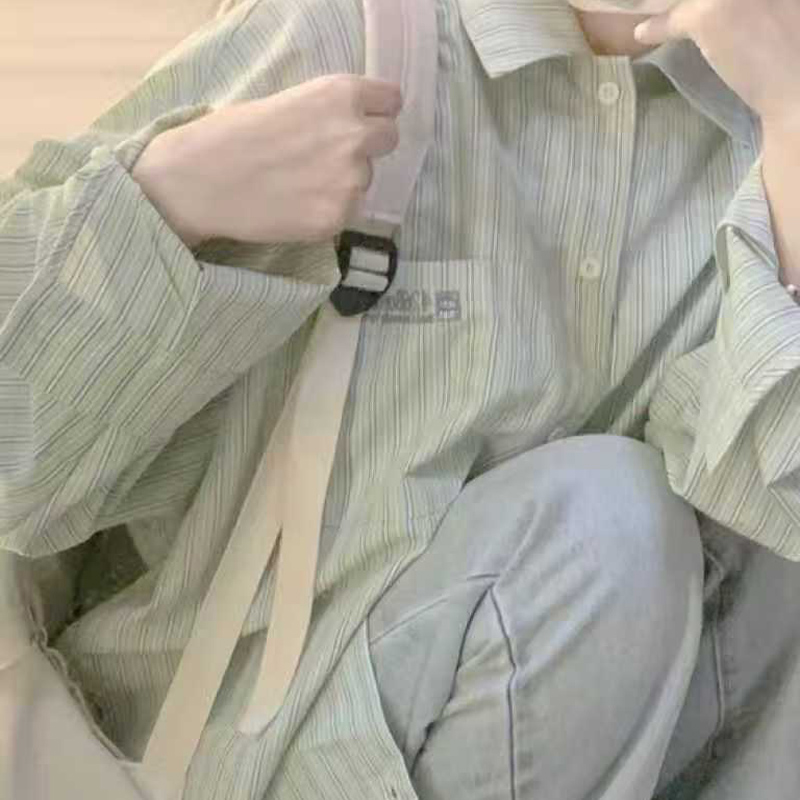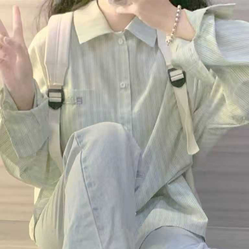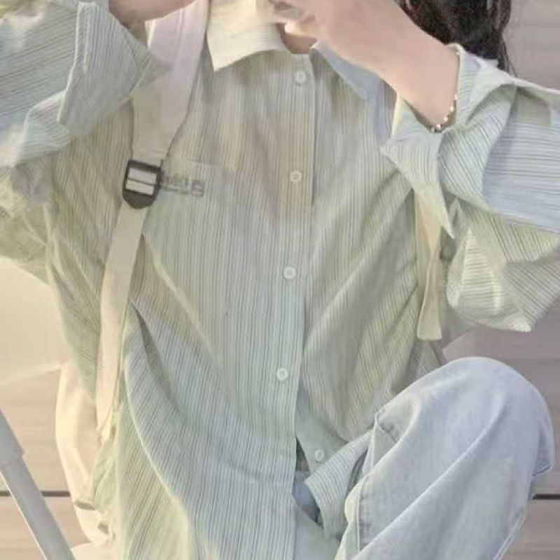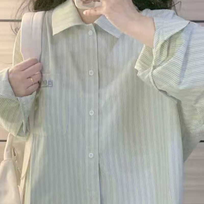 YF6997-图片色港式字母刺绣口袋慵懒风长袖翻领条纹显瘦胖MM大码衬衣
