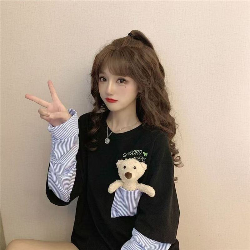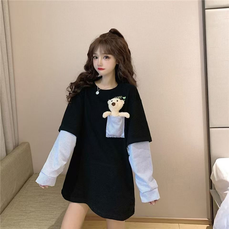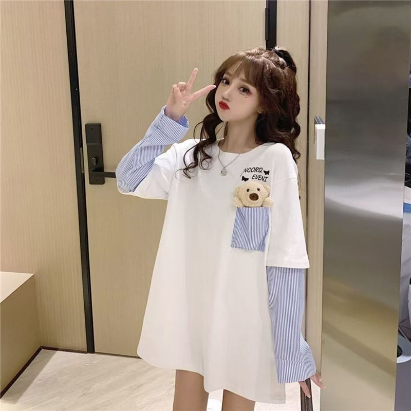 YF7004-(2色入内)假两件港式新款条纹拼接长袖刺绣口袋狗狗休闲大码T恤