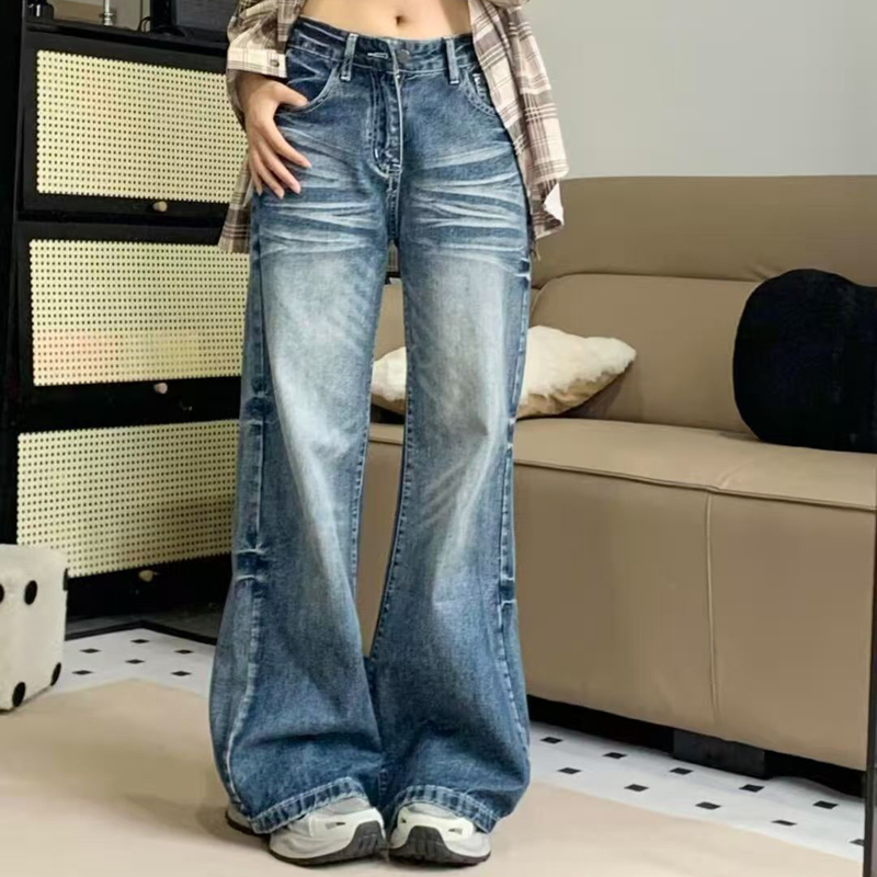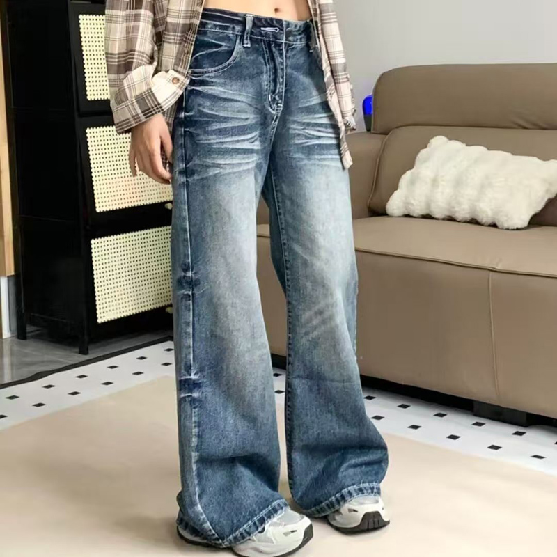 YF7007-图片色韩潮新款渐变洗水系扣高腰直筒坠地感复古蓝休闲牛仔裤
